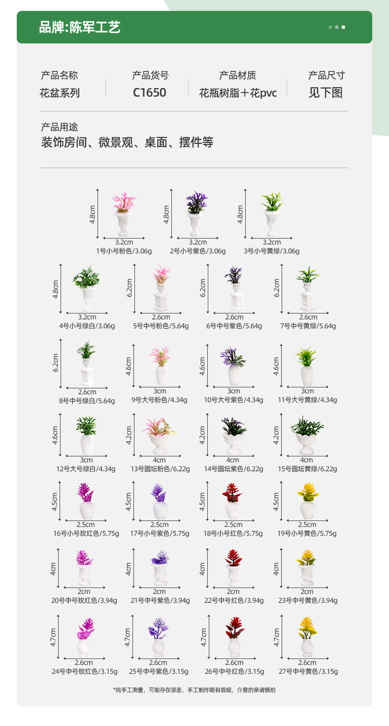 颜色 3号小号黄绿,6号中号紫色,7号中号黄绿,8号中号绿白,13号圆坛粉色,15号圆坛黄绿,16号小号玫红色,17号小号紫色,18号小号红色,20号中号玫红色,21号中号紫色,22号中号红色,23号中号黄色,24号中号玫红色,27号中号黄色