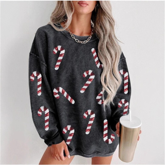 2025跨境亚马逊独立站秋冬季女士新款圣诞拐杖糖印花女士圆领卫衣