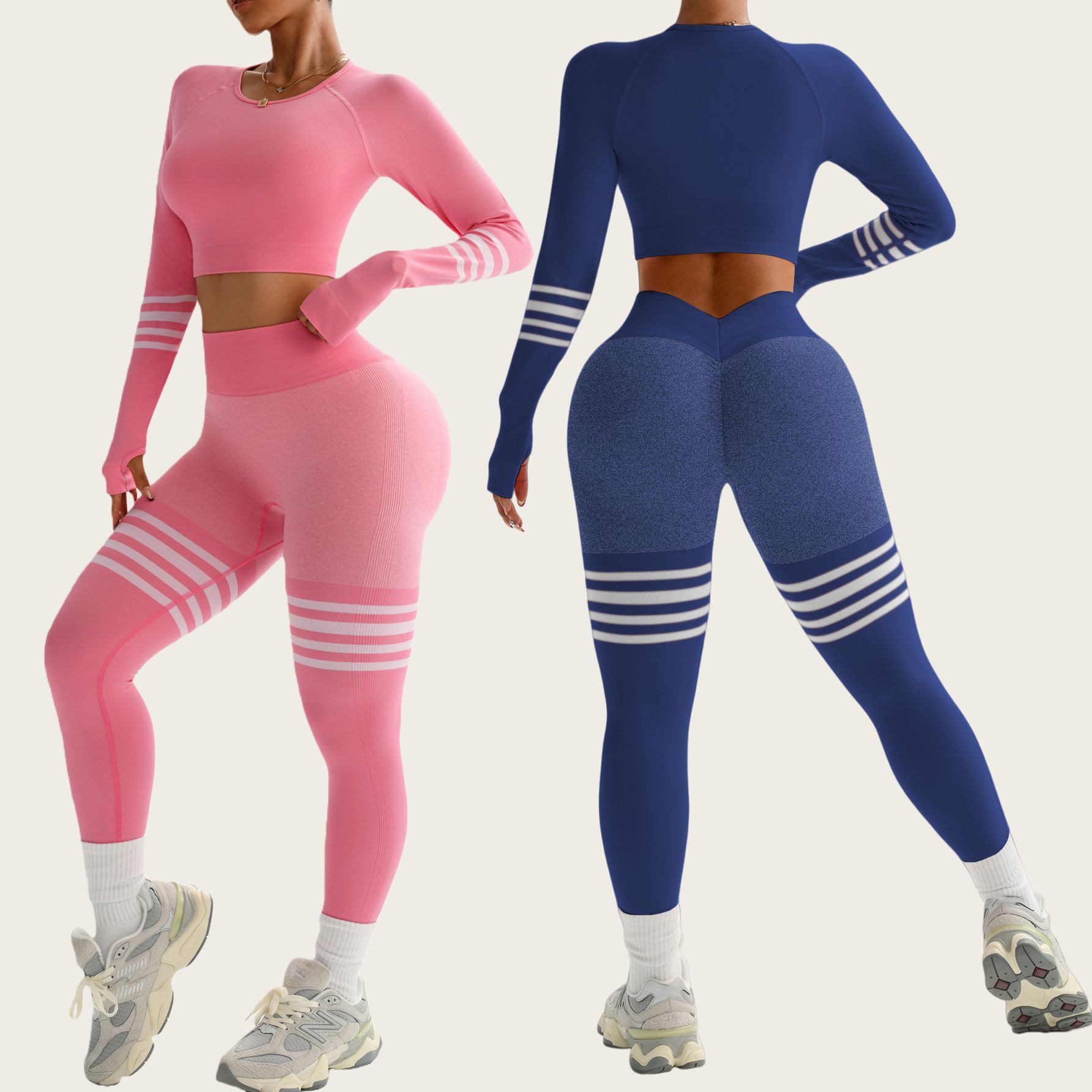 跨境欧美条纹运动紧身裤女高腰提臀瑜伽服速干健身文胸长短裤套装