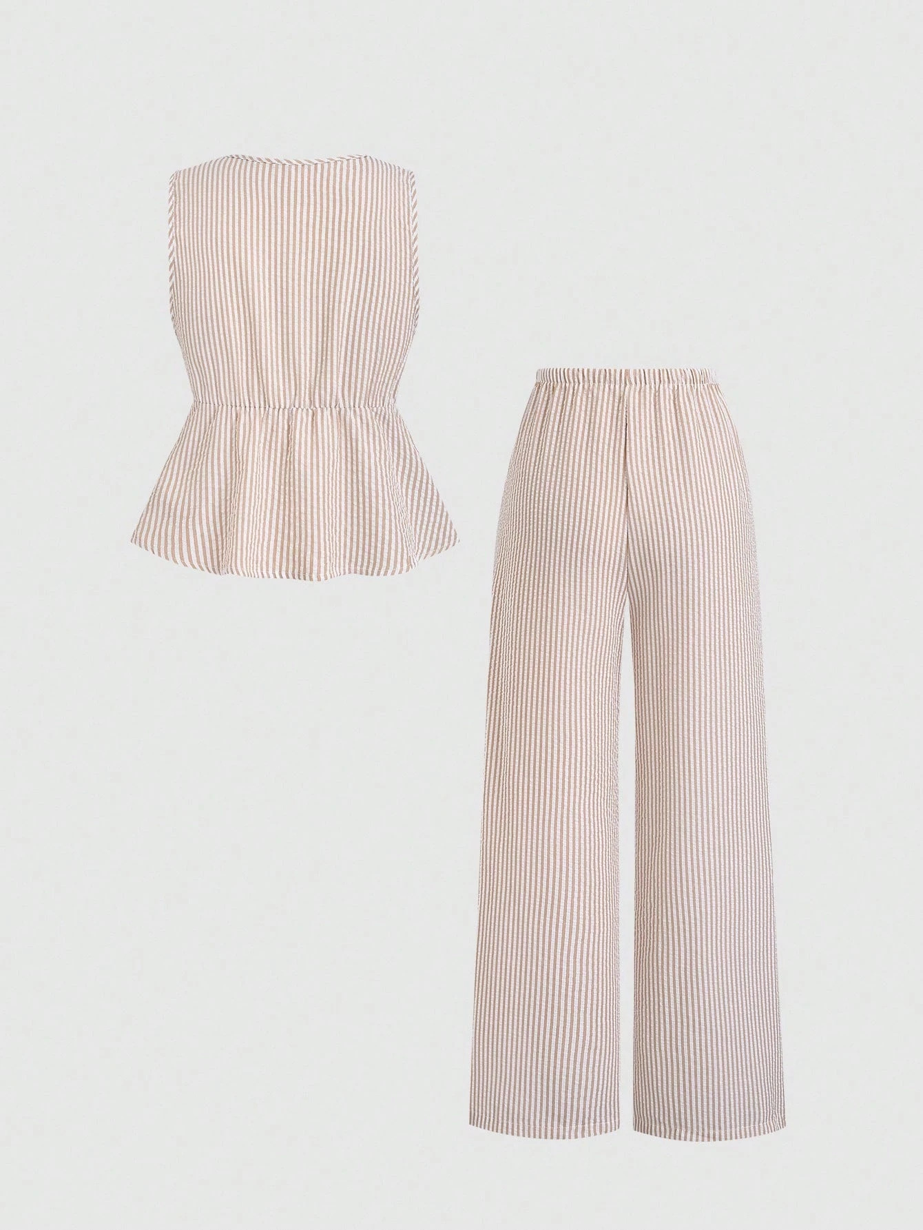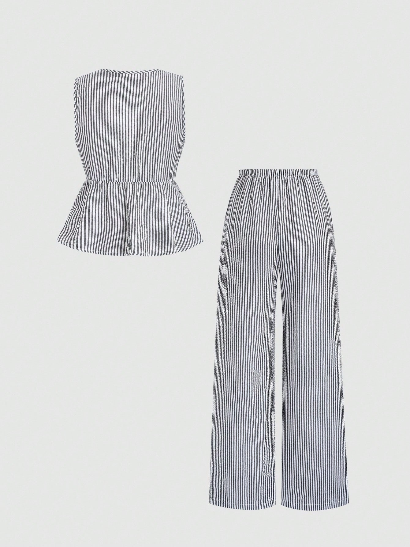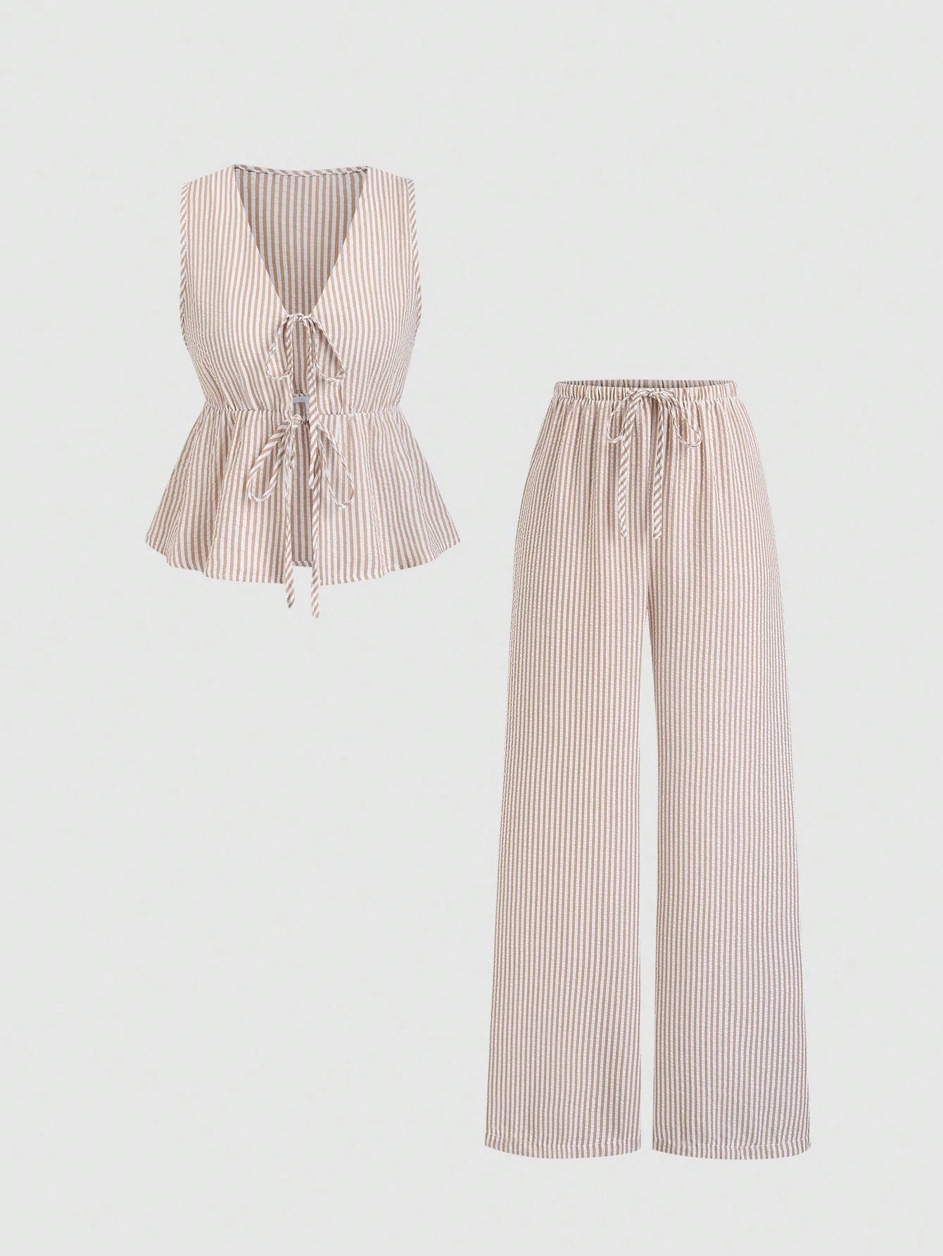 夏無地ストライプスーツカジュアルレースアップオールマッチベストルーズレースアップ無地パンツカジュアルスイートスーツ