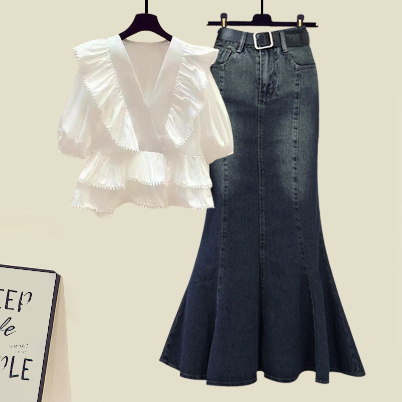 大きいサイズの婦人服の夏のスーツの女性の2025新型の気質はやせているハスの葉の辺の半袖のデニムの半身のスカートの2つのセットを現します。