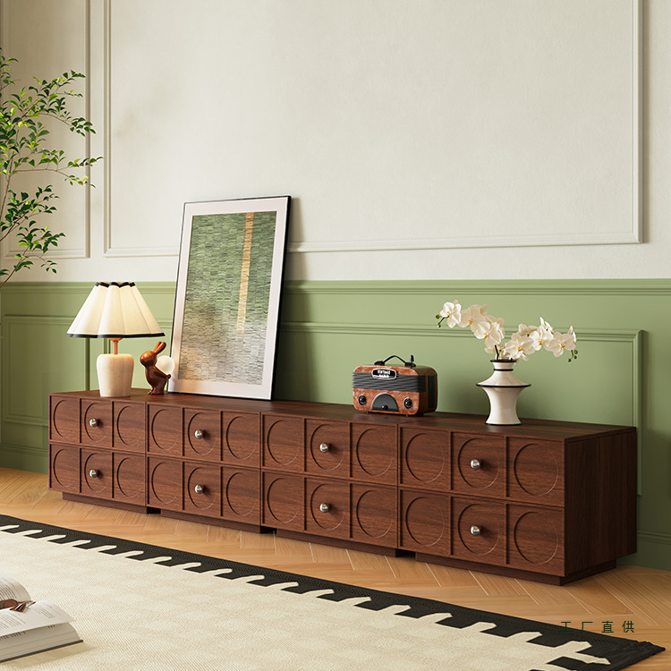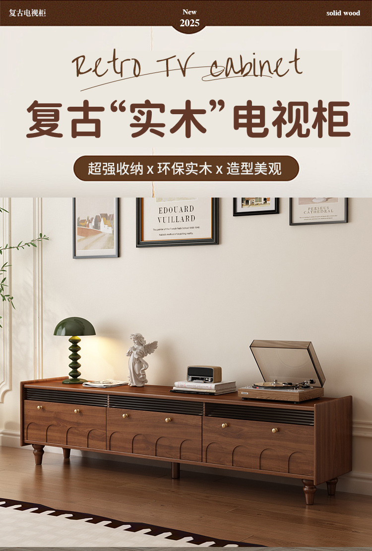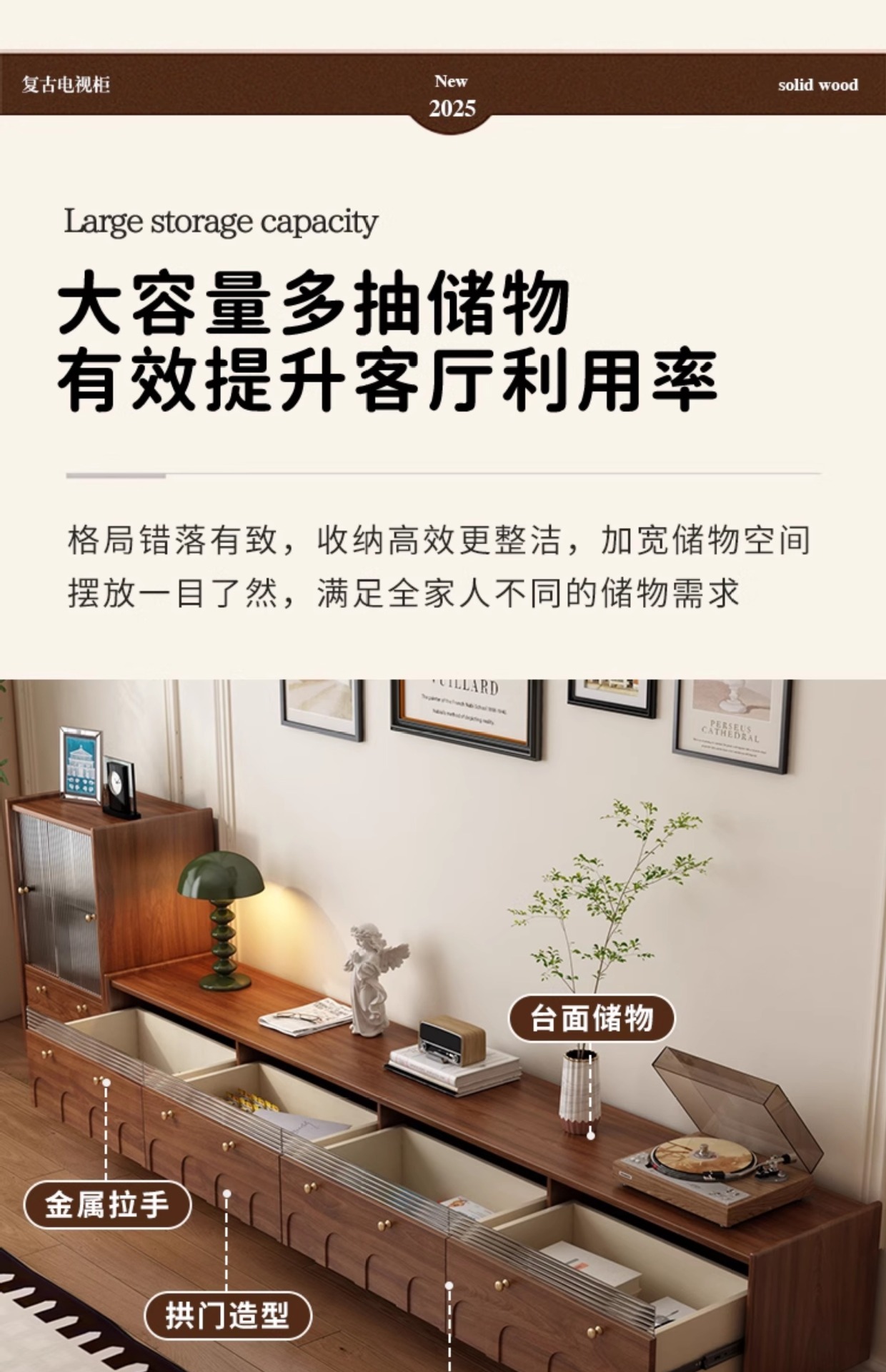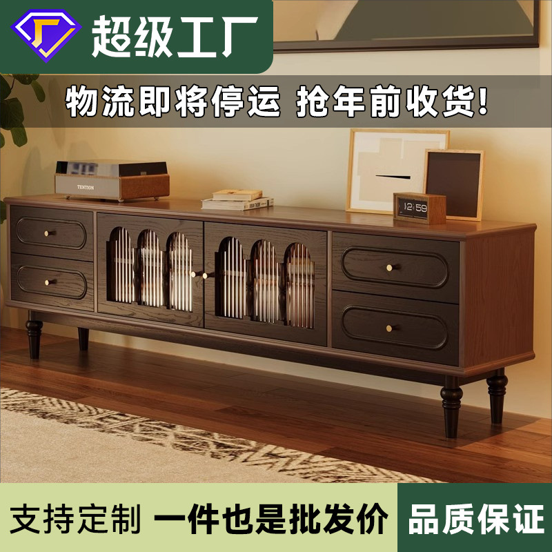 全实木电视柜中古风客厅家用2025新款收纳柜一体落地复古储物边柜