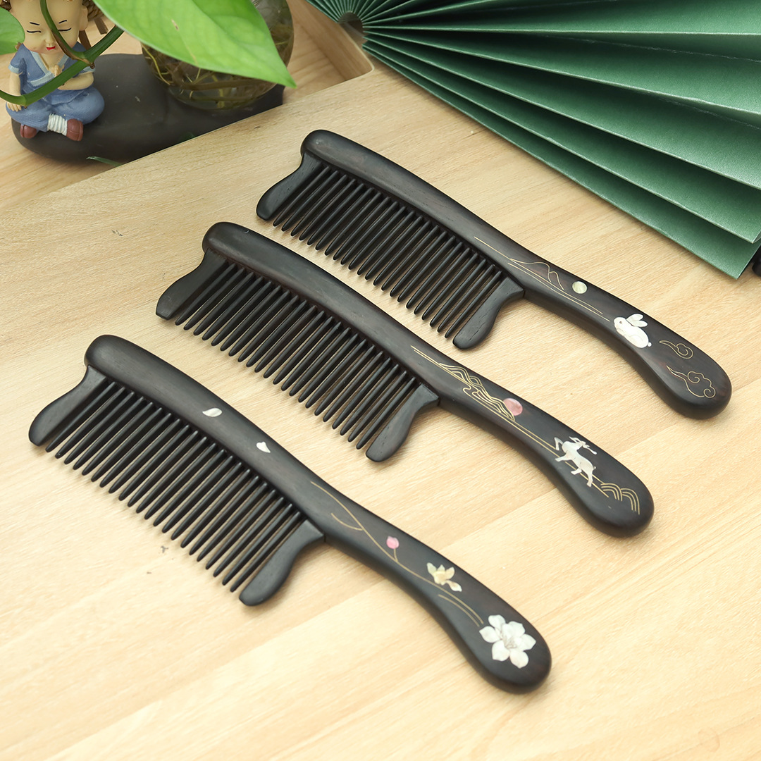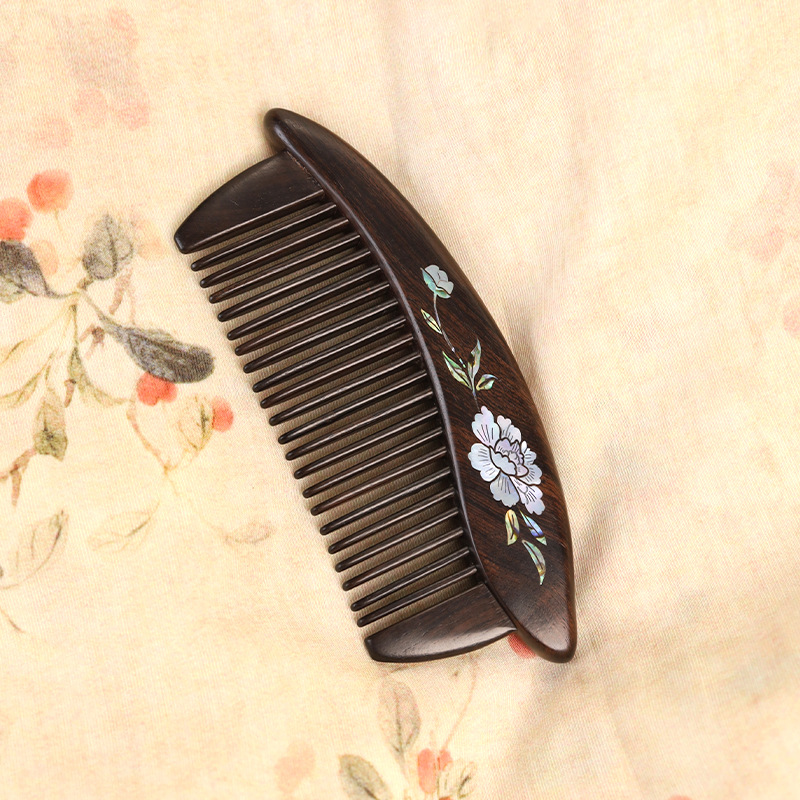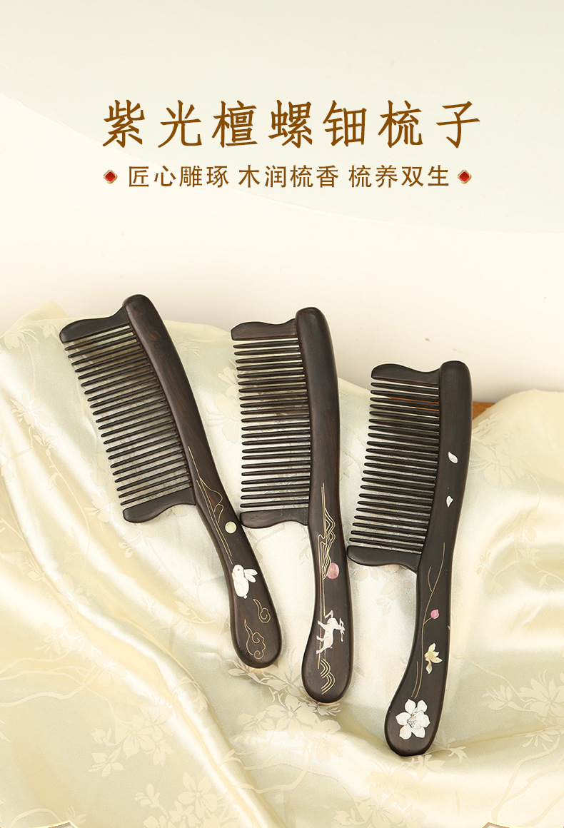紫光檀螺钿鲍鱼贝插齿梳木梳子女士礼物批发密齿梳实木无漆家用梳