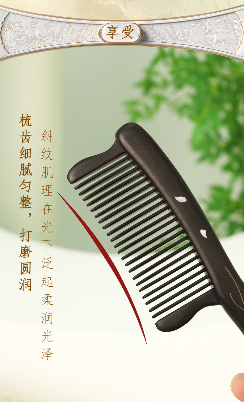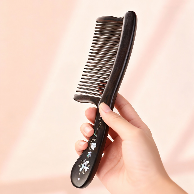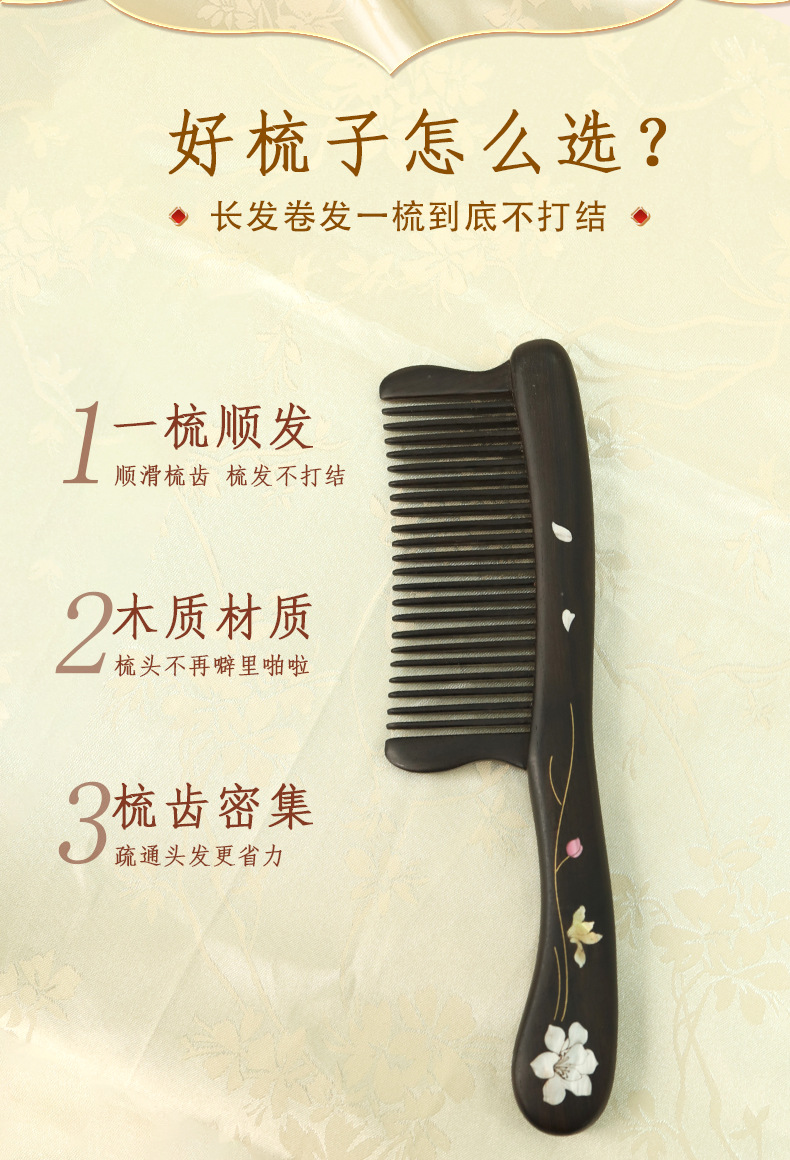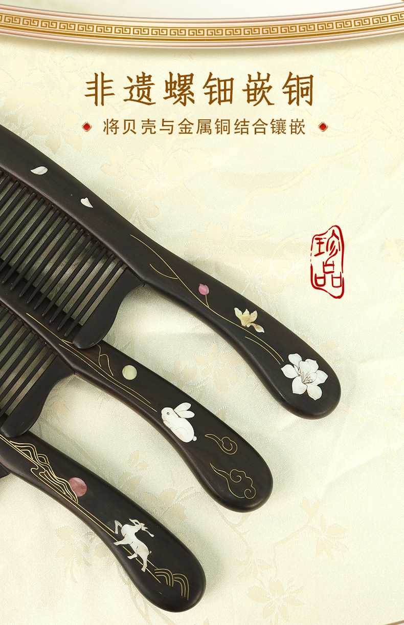 紫光檀螺钿鲍鱼贝插齿梳木梳子女士礼物批发密齿梳实木无漆家用梳
