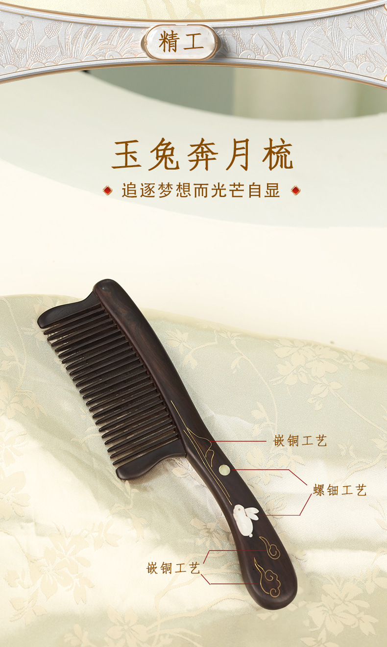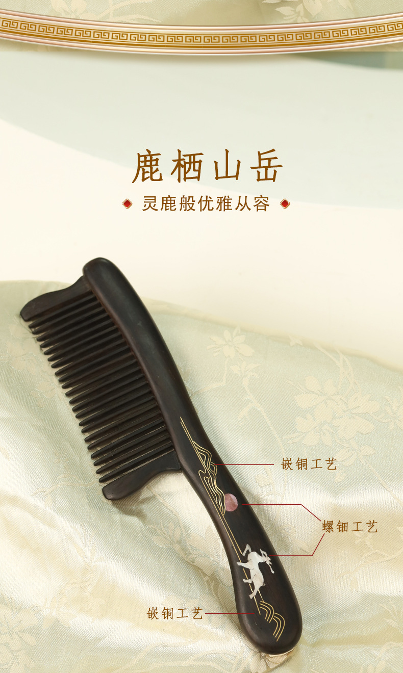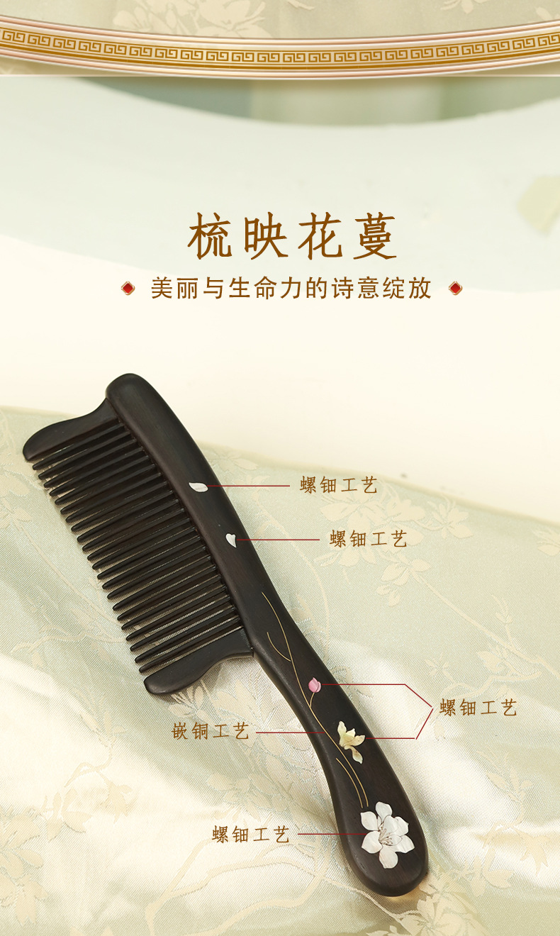 天然紫光檀木梳中式螺钿嵌铜梳子乌木细齿按摩梳实木古风梳子女生