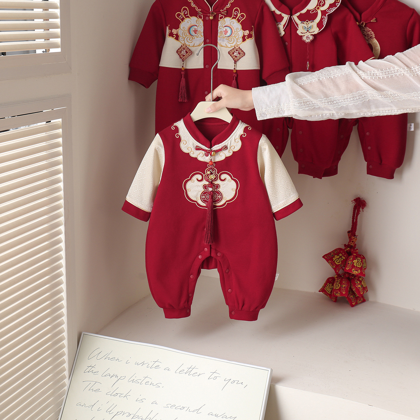 一周岁宝宝生日礼服春装国风中式唐装婴儿连体衣新生儿红色过年服