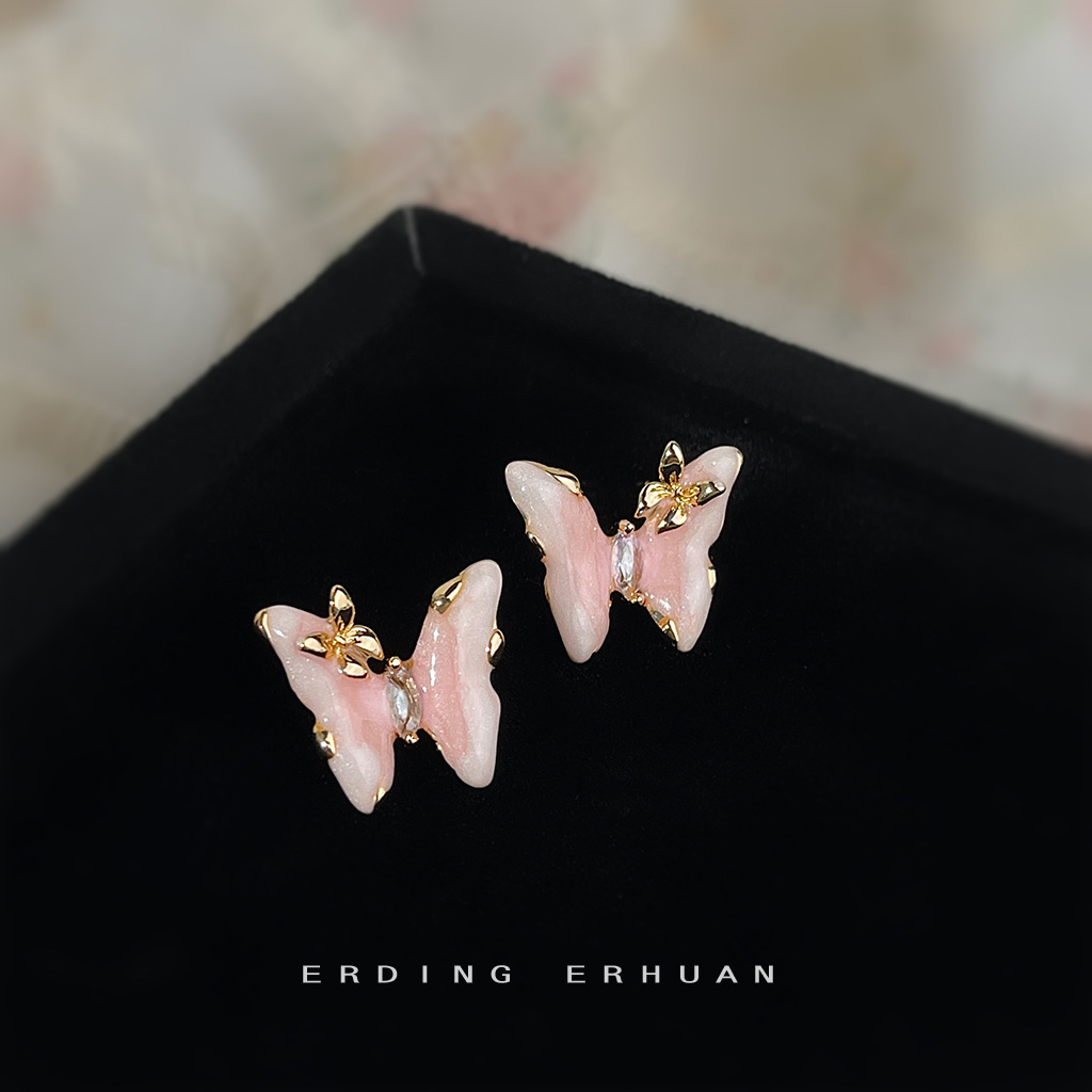 フレッシュで甘い ~ オリジナルデザインピンクグラデーションエナメル滴釉薬蝶耳飾り気質優雅新イヤリング女