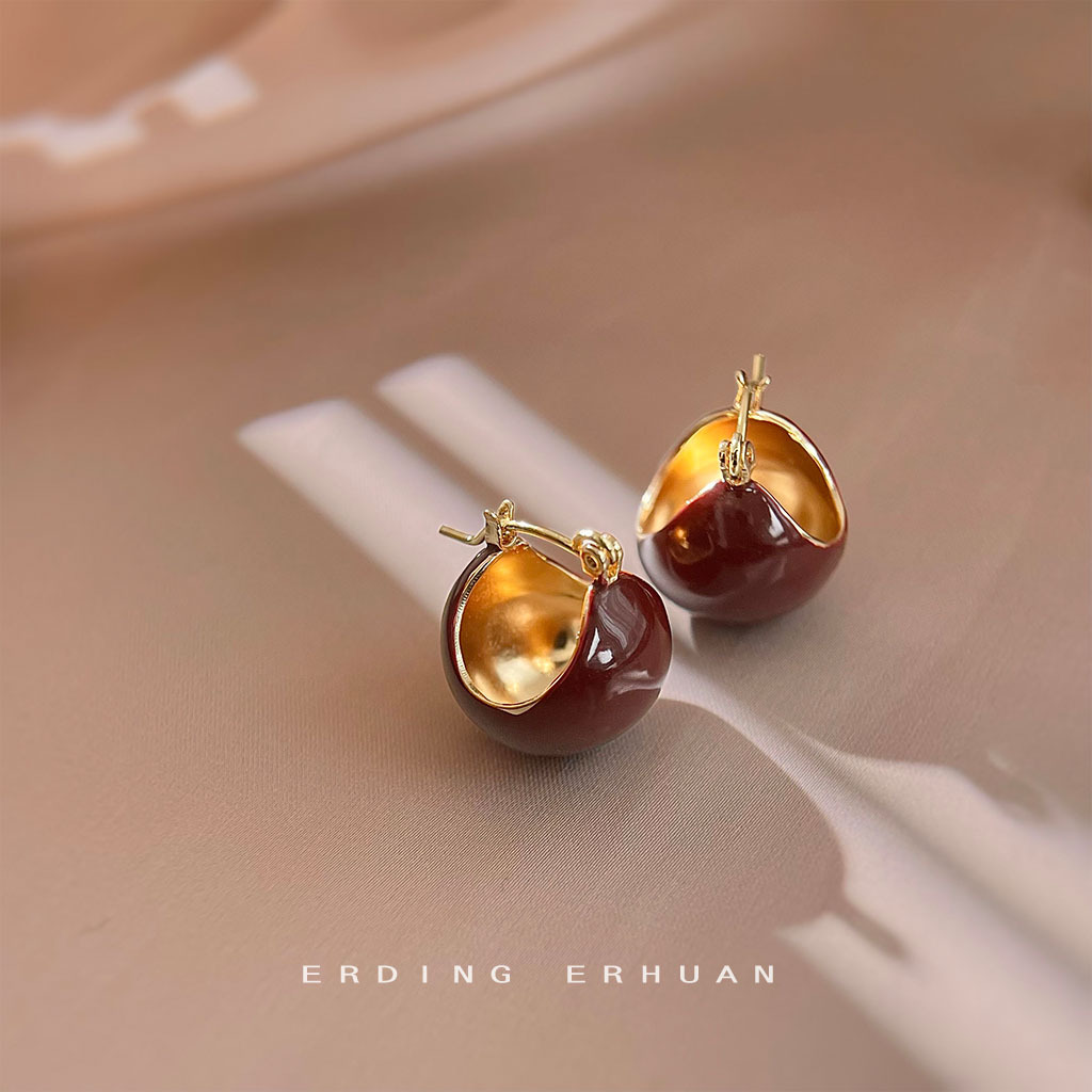 アカシア豆復古酒紅小衆気質軽豪華高級感滴釉耳ボタン円形豆港風耳飾り工場