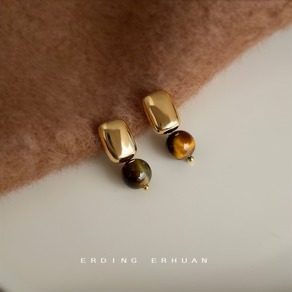美拉德风天然石虎眼石时尚高级感镀14K新款几何方形耳饰 工厂耳环