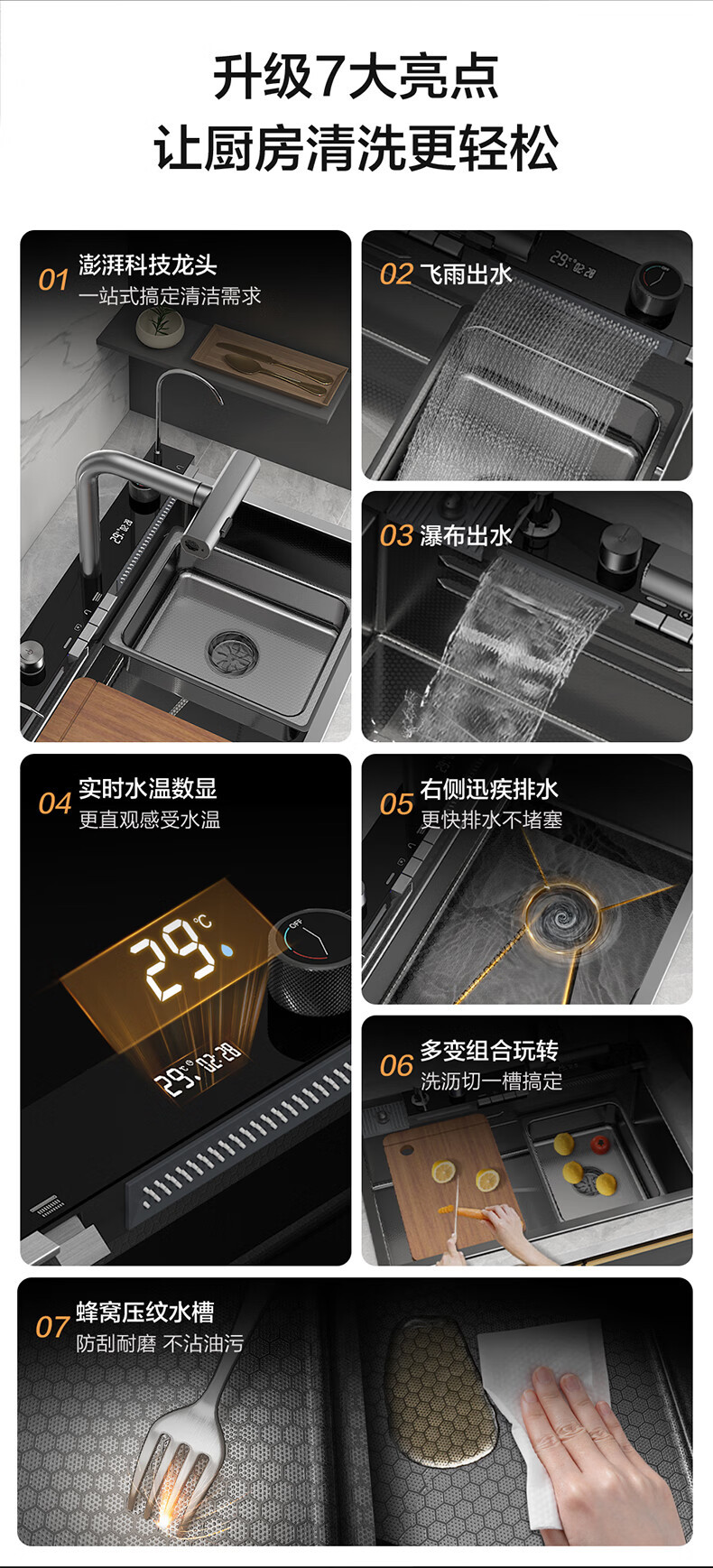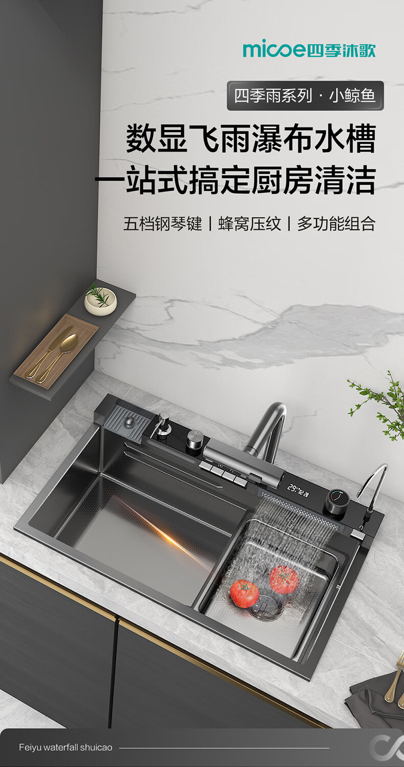 Four Seasons Muge キッチンシンク 大型シングルシンク 304 ステンレス鋼シンク レインフォールウォーターフォール
