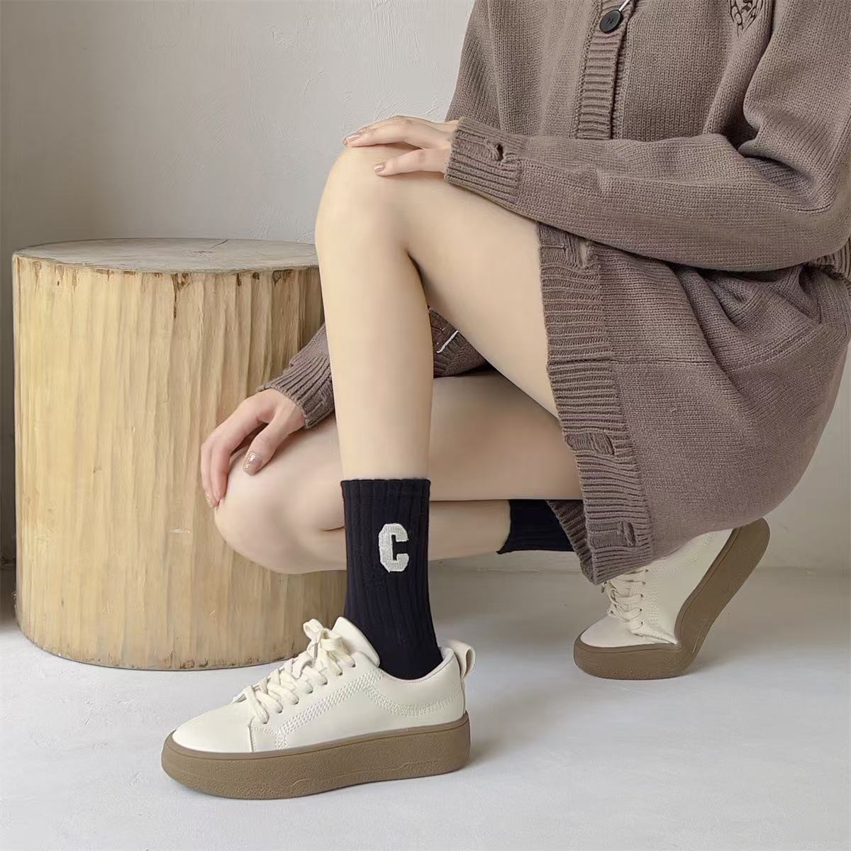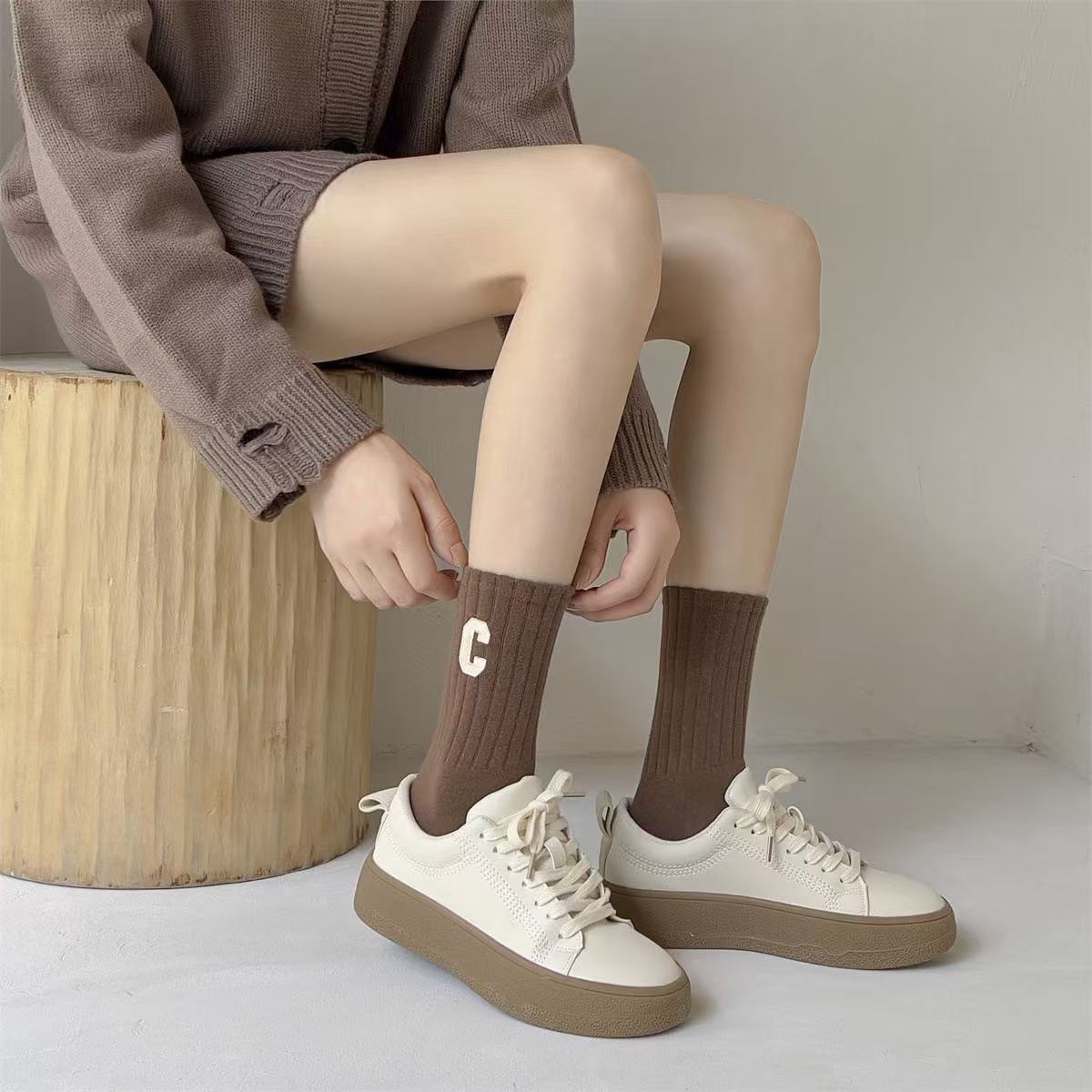 秋冬用ソックス レディース ミドル丈ソックス 多用途 シャークパンツ ロングソックス スポーツカジュアルソックス メイラードレターソックス 女性用