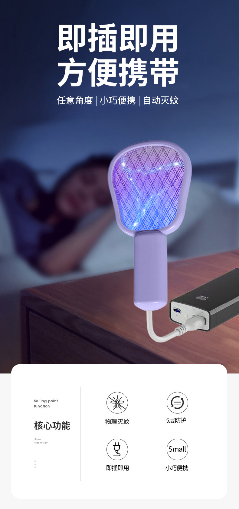 新型ミニ電気蚊取りusb充電式家庭用ハエ撮り屋外携帯型二合一強力蚊取りランプ