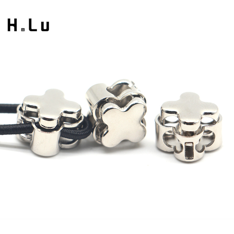 金属の四つ葉のクローバーのスプリングの紐は突撃して服のダウンジャケットのカバーの金属の部品の花型のブタの鼻の調節のボタンを掛けます。