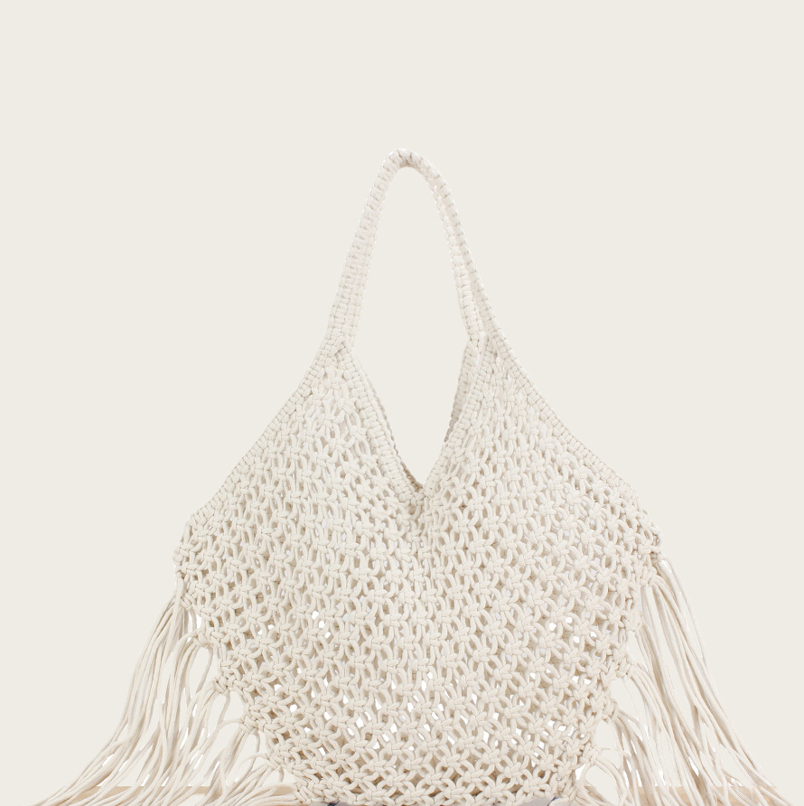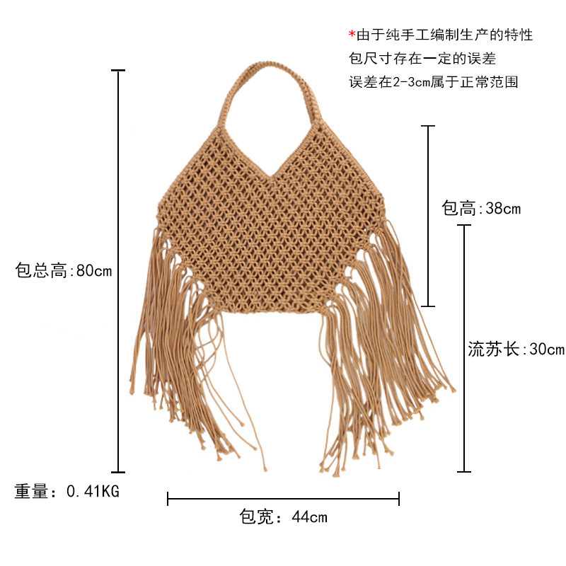 韓国風ロングタッセル付きシングルショルダー綿糸編みバッグ レディース新作 大きめ三角形透かし編み草編みバッグ 海辺リゾートビーチバッグ