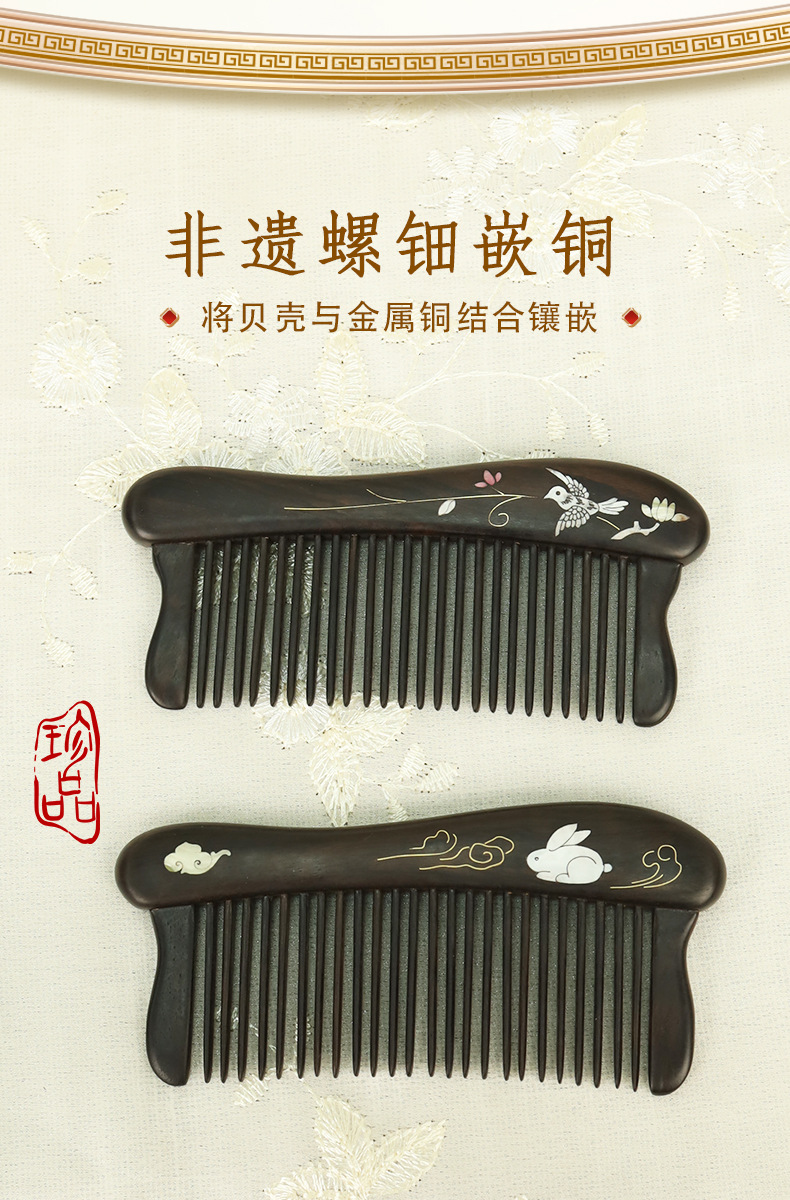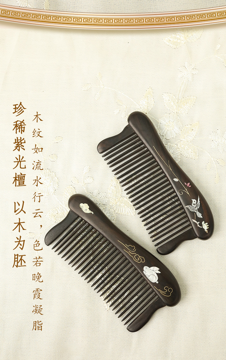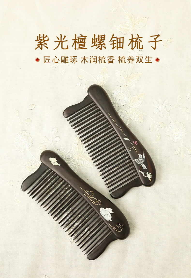 紫光檀螺钿鲍鱼贝插齿梳木梳子女士礼物批发密齿梳实木无漆家用梳