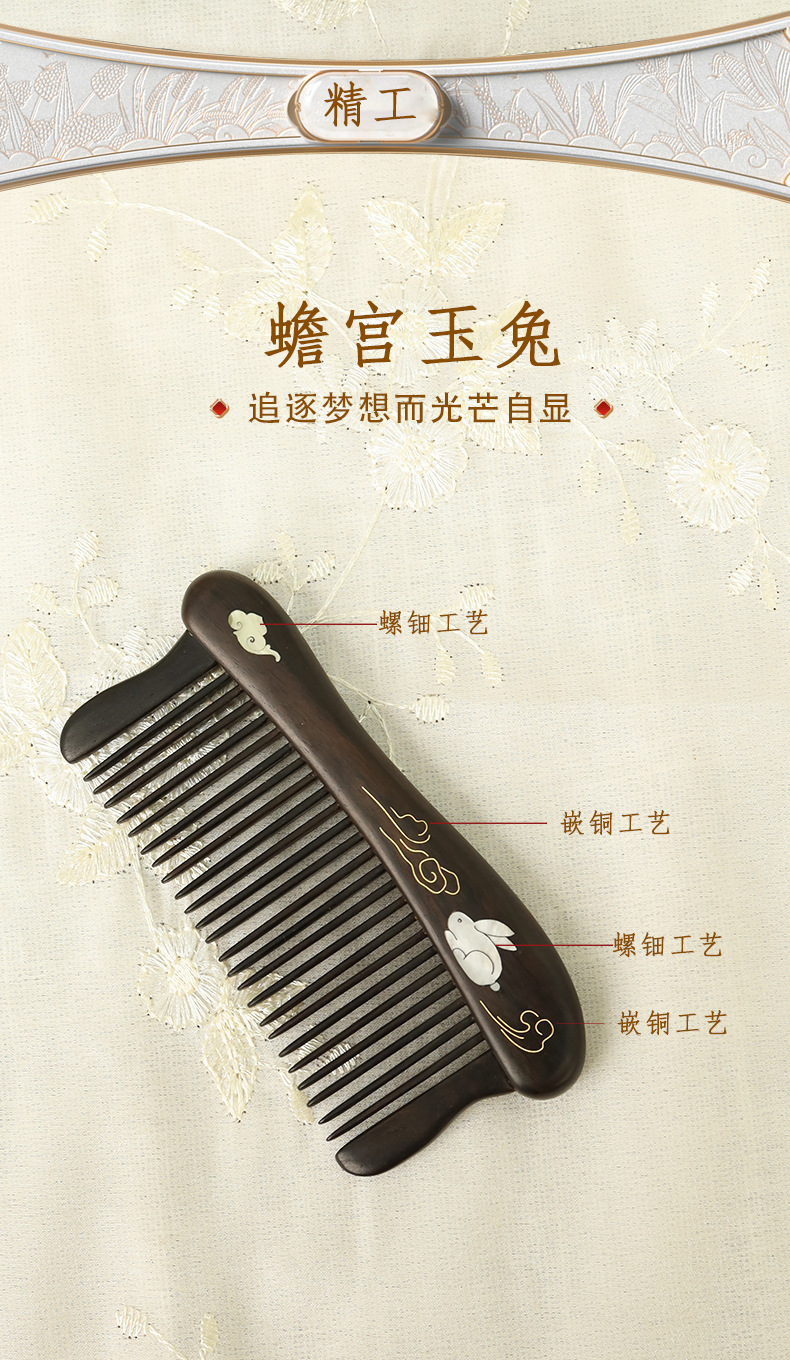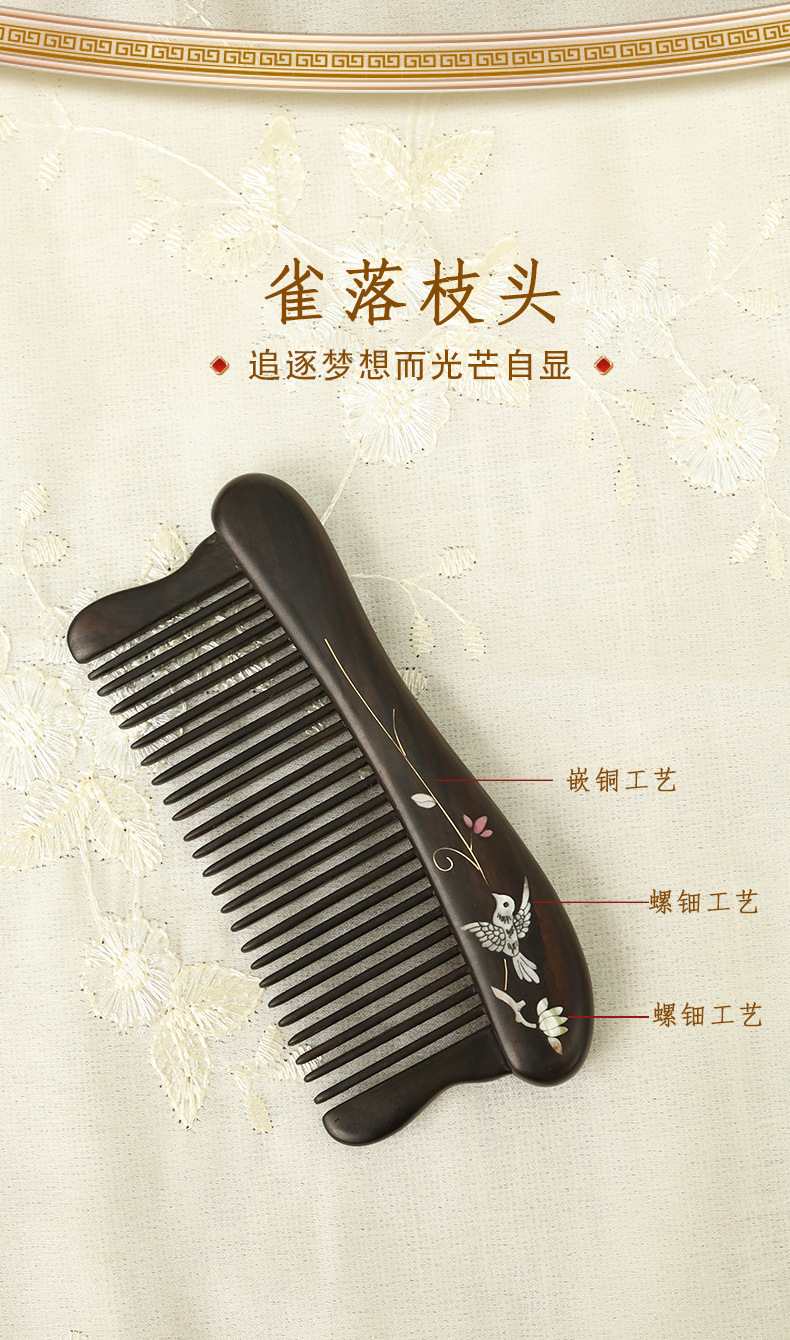 天然紫光檀木梳中式螺钿嵌铜梳子乌木细齿按摩梳实木古风梳子女生