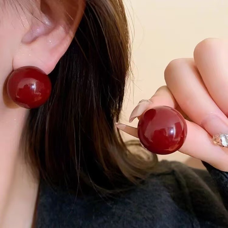 抖音爆款开口笑车里子红色仿珍珠耳钉新年喜庆复古显脸小百搭耳饰