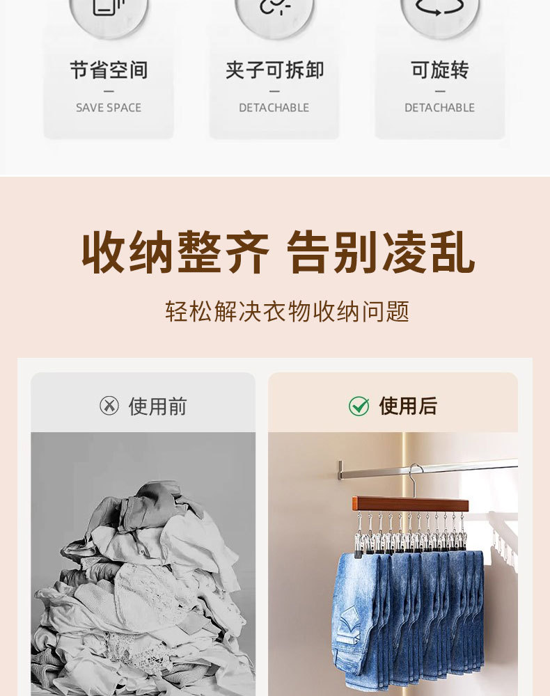 実木ズボンクリップ家庭用たんす無痕帽子スカート収納回転可能多クリップ学生寮収納クリップ