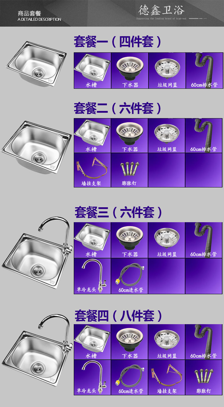 パッケージ 1 (洗面器 + 水),パッケージ 2 (洗面器 + 排水口 + ブラケット),パッケージ 3 (洗面器 + 排水管 + 蛇口 + 水道管),パッケージ 4 (洗面器 + 排水管 + ブラケット + 蛇口 + 水道管)