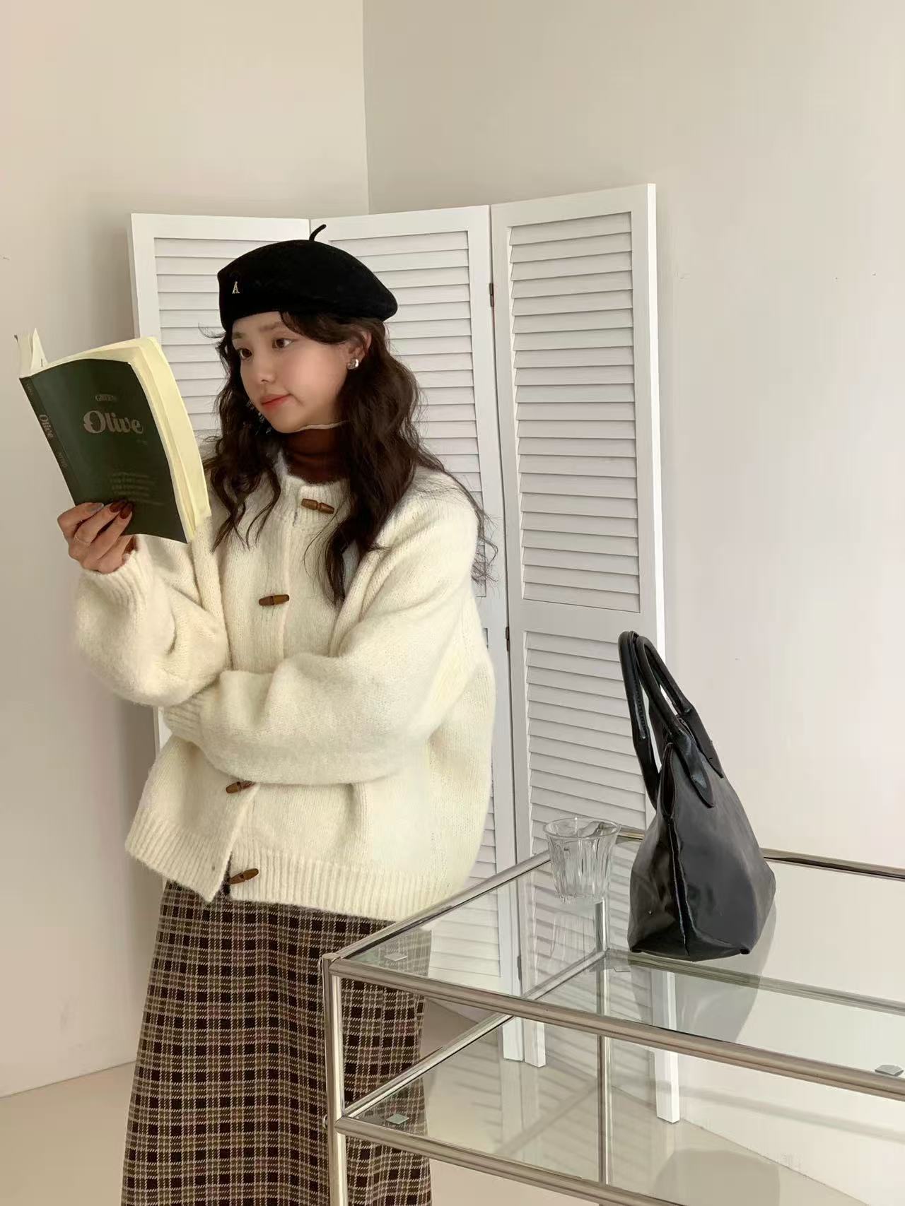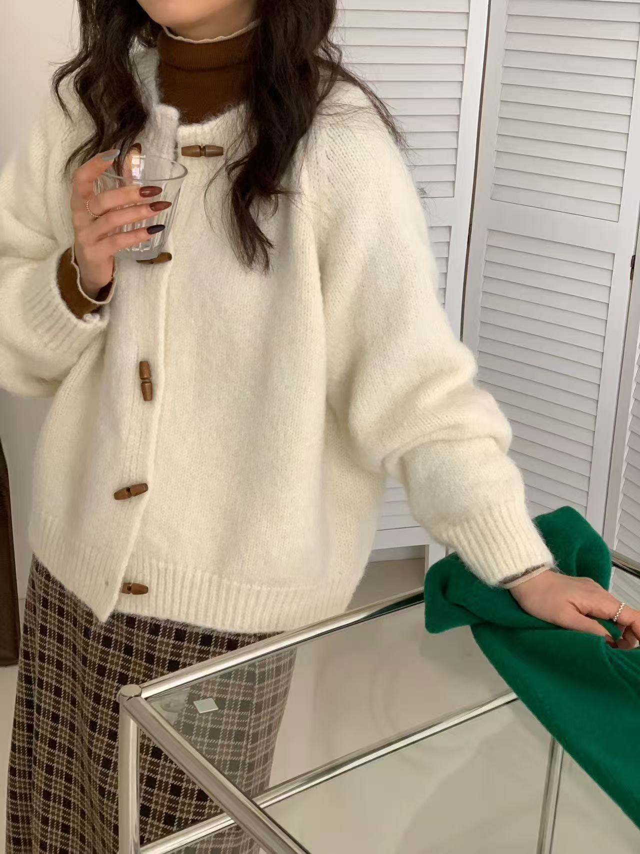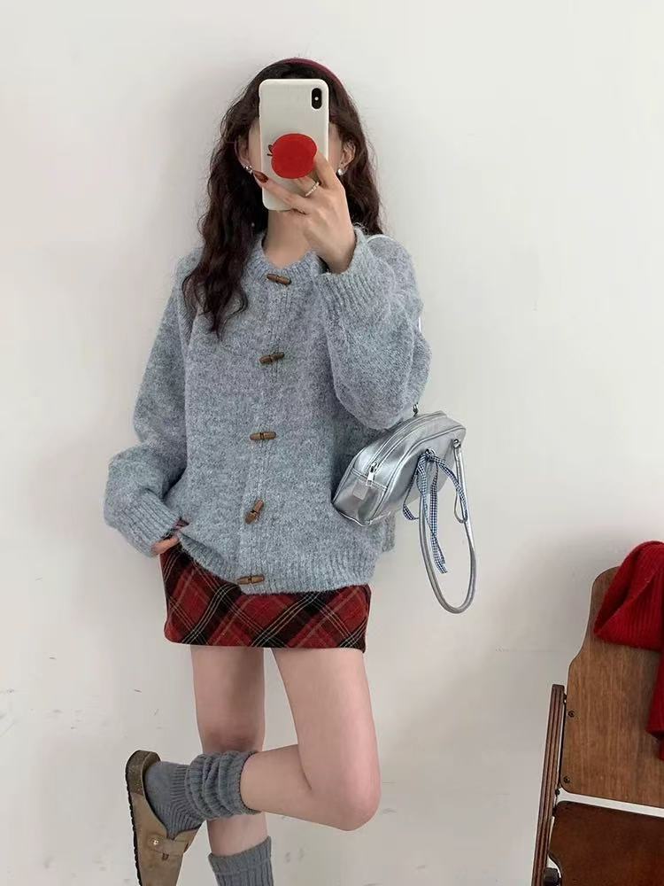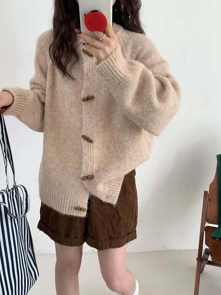 温柔风圆领牛角扣针织开衫女2025秋冬季新款女装宽松软糯毛衣外套