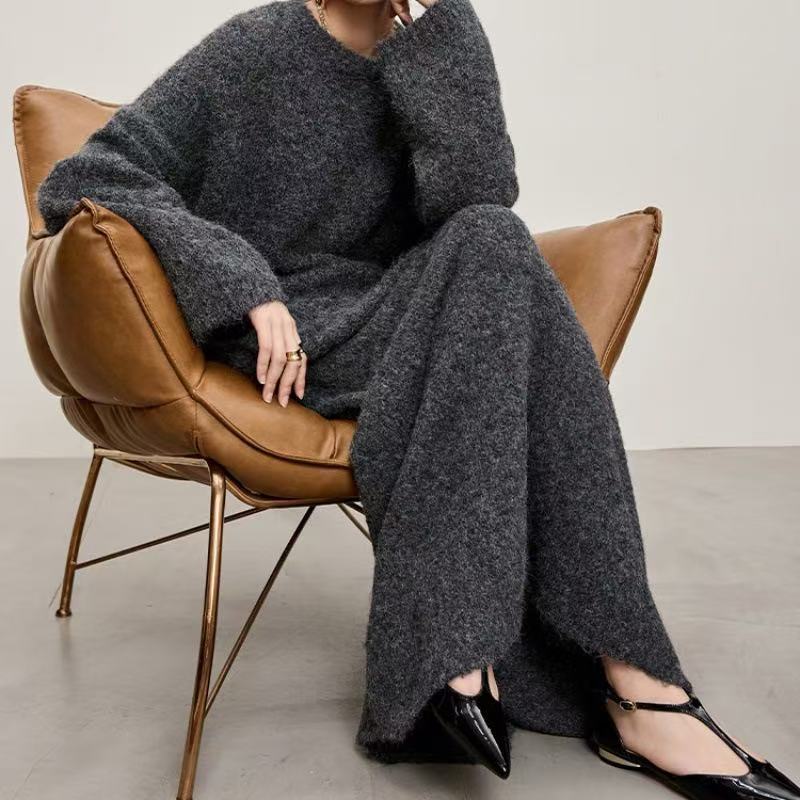 韓国スタイルのレイジースタイルニットスーツ女性のための秋と冬の柔らかいワックス状プルオーバーセーター + カールワイドレッグショーツ卸売在庫