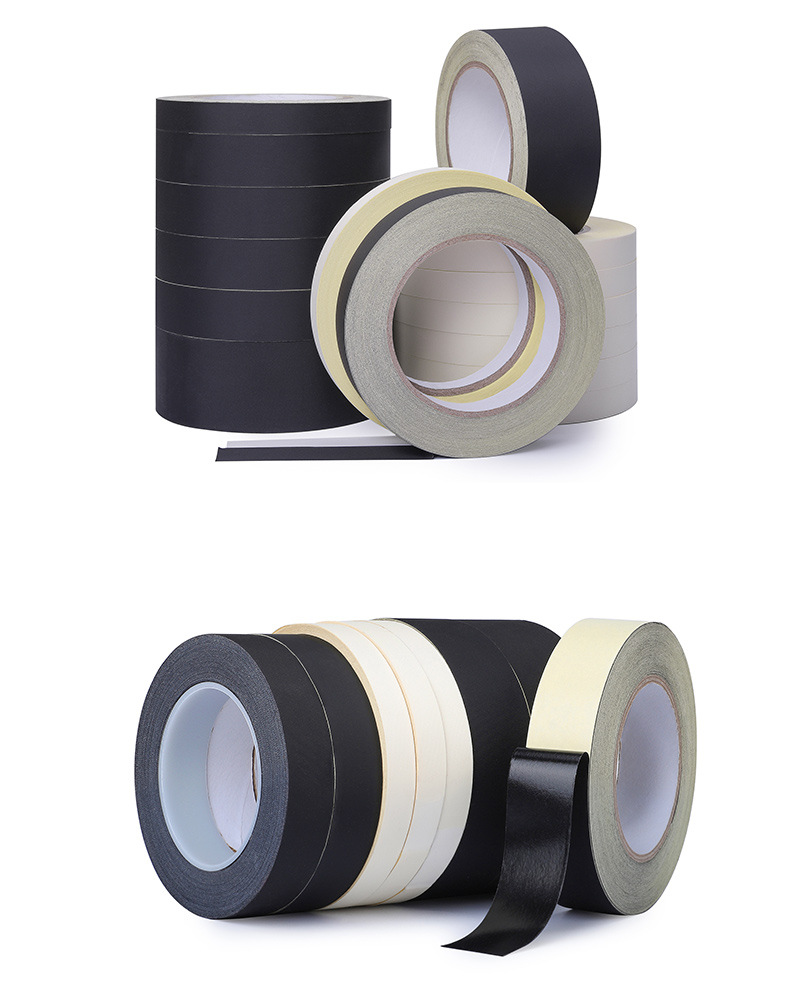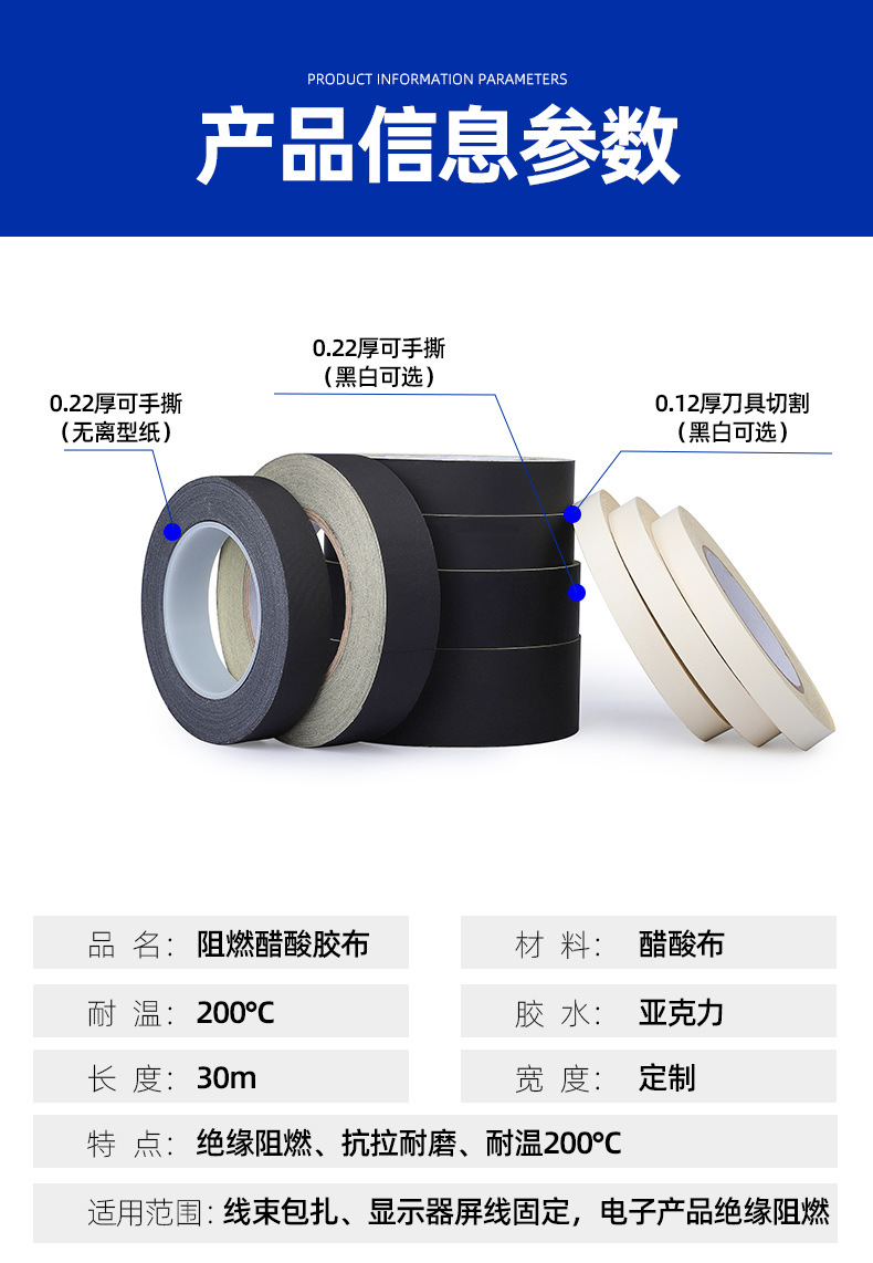 黒0.22厚の剥離紙(手で切れます),黒色の0.12厚の剥離紙(剥がすにはナイフが必要),白色0.22厚剥離紙(手で切れます),白色0.12厚剥離紙(カッターで切り離す必要があります),難燃性、剥離紙なしのアセテートテープ
