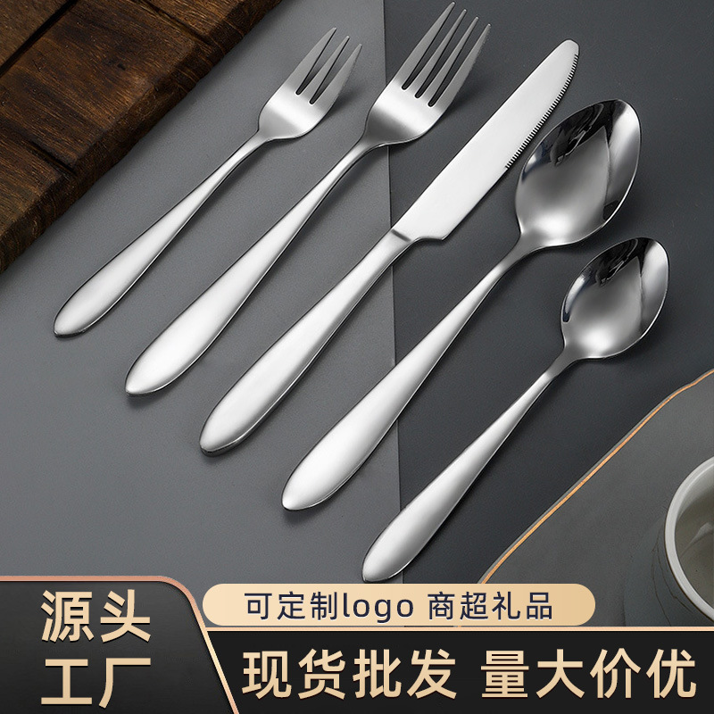 ステンレス製のナイフ、フォーク、スプーン、食器5点セット、家庭用ステーキナイフ、フォーク、フルーツフォーク、学生スプーン、ロゴ印刷可能