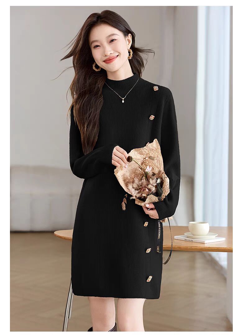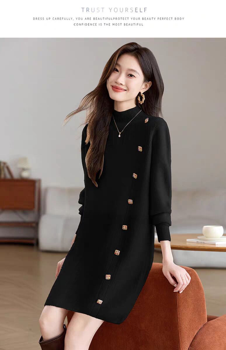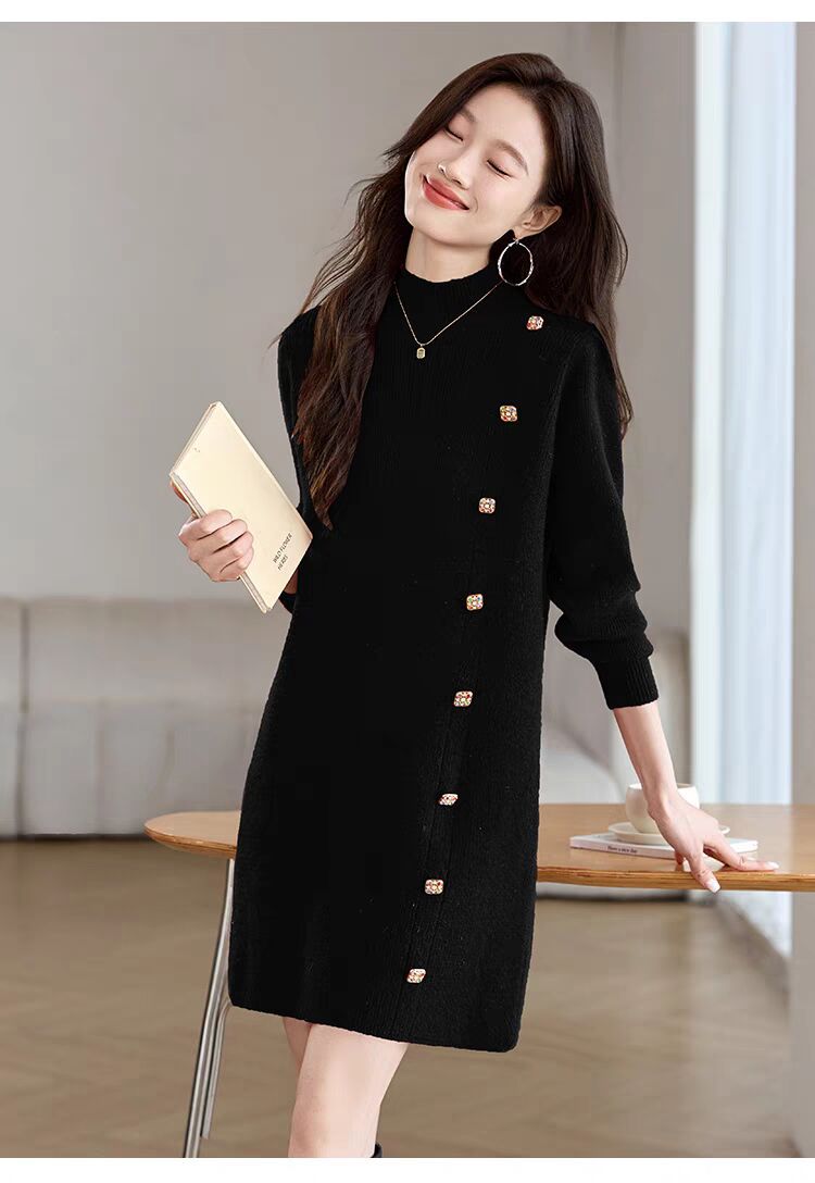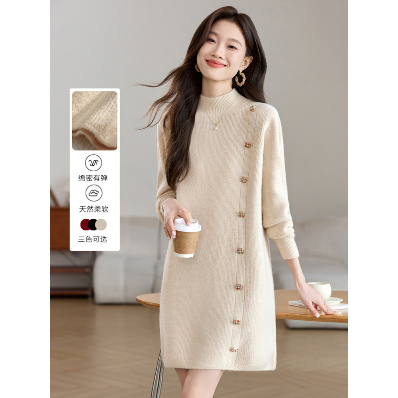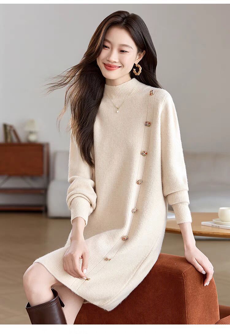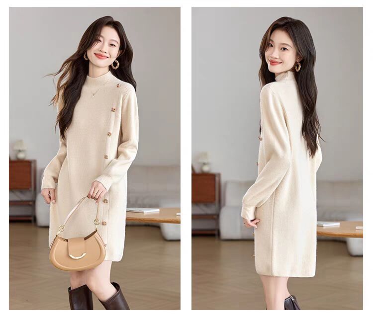 2025秋冬用コートやセーターに合わせる、レディースラウンドネックゆったり長袖インナー用ニットワンピース、厚手でトレンド感あり