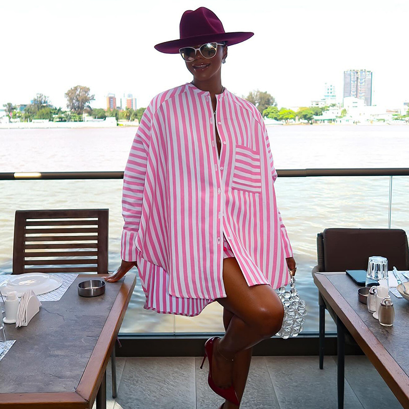 欧美跨境女装2025秋季新款时尚粉丝条纹圆领长袖衬衫阔腿短裤套装