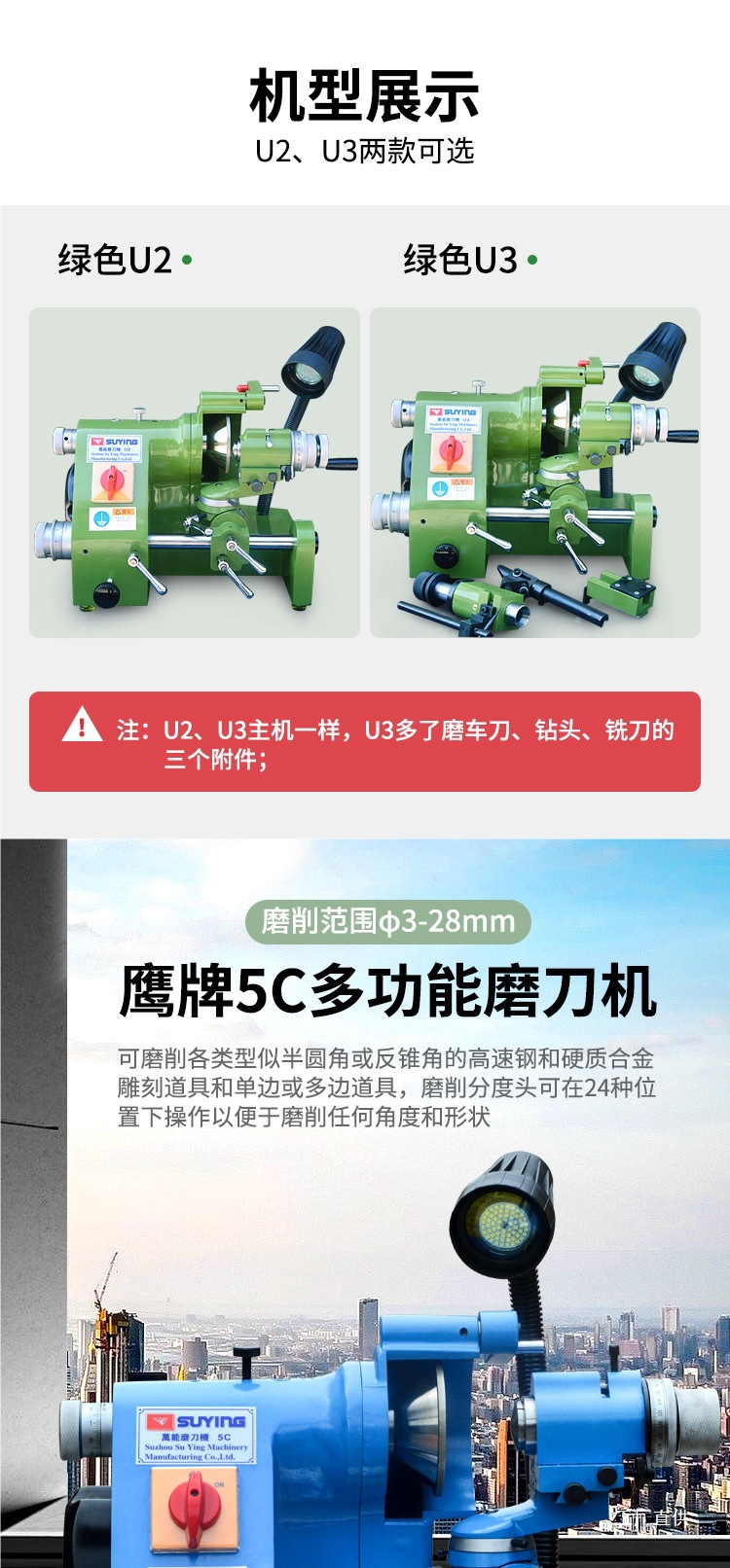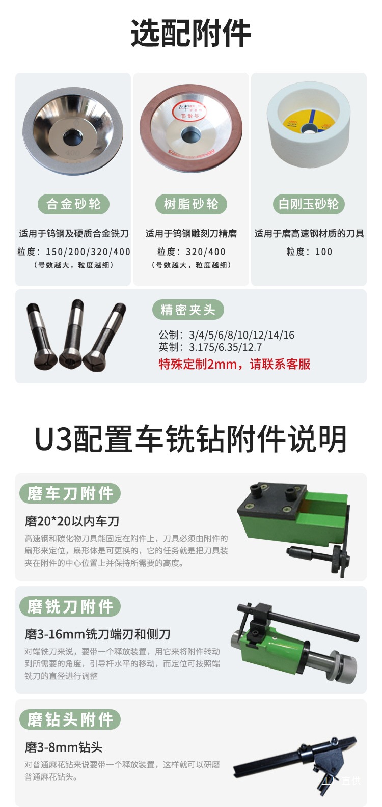 规格 昆雕30磨刀机220V(无砂轮夹头),昆雕 30磨刀机220V配夹头3个砂轮1个,鹰牌U2主机(不带砂轮夹头),鹰牌U2(3支夹头 白钢砂轮1个),鹰牌U2(3支夹头 合金砂轮1个),鹰牌U2(5支夹头 白钢砂轮1个),鹰牌U2(5支夹头 合金砂轮1个),鹰牌U3(3支夹头+砂轮+附件),鹰牌U3(5支夹头+砂轮+附件),鹰牌新款5C磨刀机 夹头9只+砂轮2种,升级款U2 (夹头8只+砂轮3种 木箱 高配精密,升级款U3(夹头8只+砂轮3种+附件 木箱 高配精密,工作台(570*570),全自动铣刀磨刀机