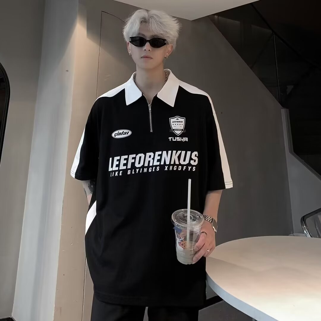 ポロシャツ半袖 Tシャツメンズ夏新アメリカンレトロストリートルーズステッチコントラストカラーラペル半袖 Tシャツ