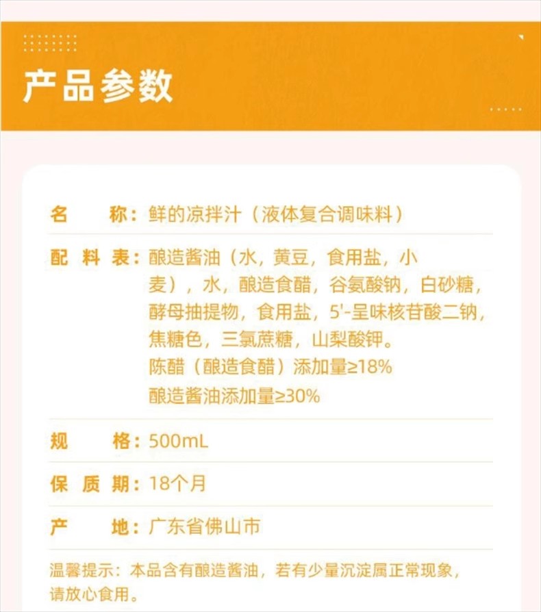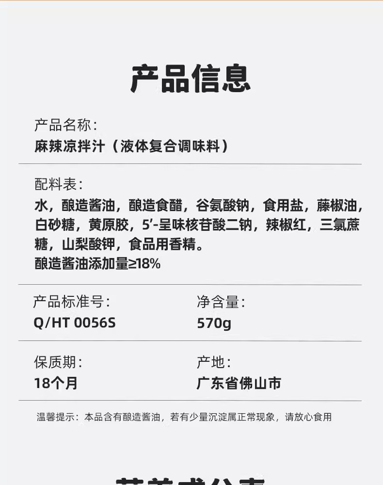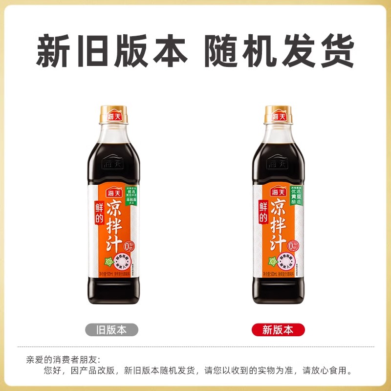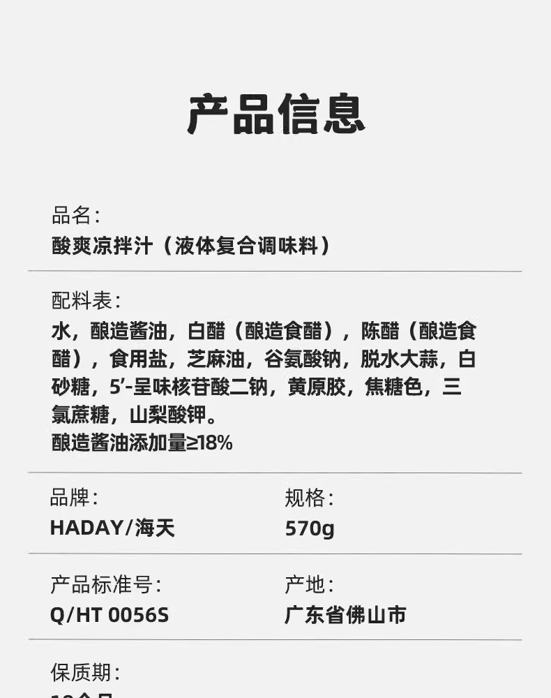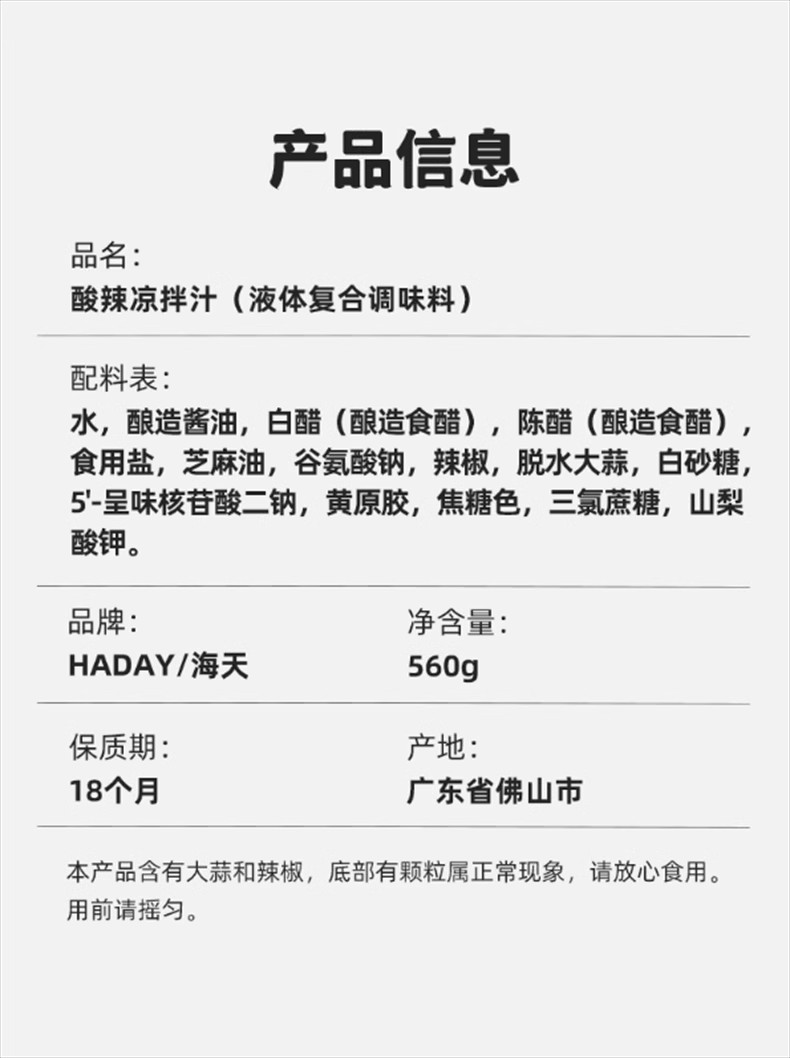 包装规格 酸辣凉拌汁560g*1瓶,酸辣凉拌汁560g*2瓶,海天鲜的凉拌汁500ml*1瓶,海天鲜的凉拌汁500ml*2瓶,海天鲜的凉拌汁1.28L*1瓶,酸爽凉拌汁570g*1瓶,酸爽凉拌汁570g*2瓶,麻辣凉拌汁570g*1瓶,麻辣凉拌汁570g*2瓶,麻辣凉拌汁*1瓶+酸爽凉拌汁*1瓶,酸辣凉拌汁*1瓶+鲜的凉拌汁*1瓶,麻辣凉拌汁*1瓶+鲜的凉拌汁*1瓶
