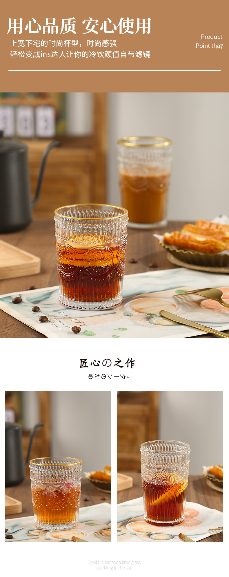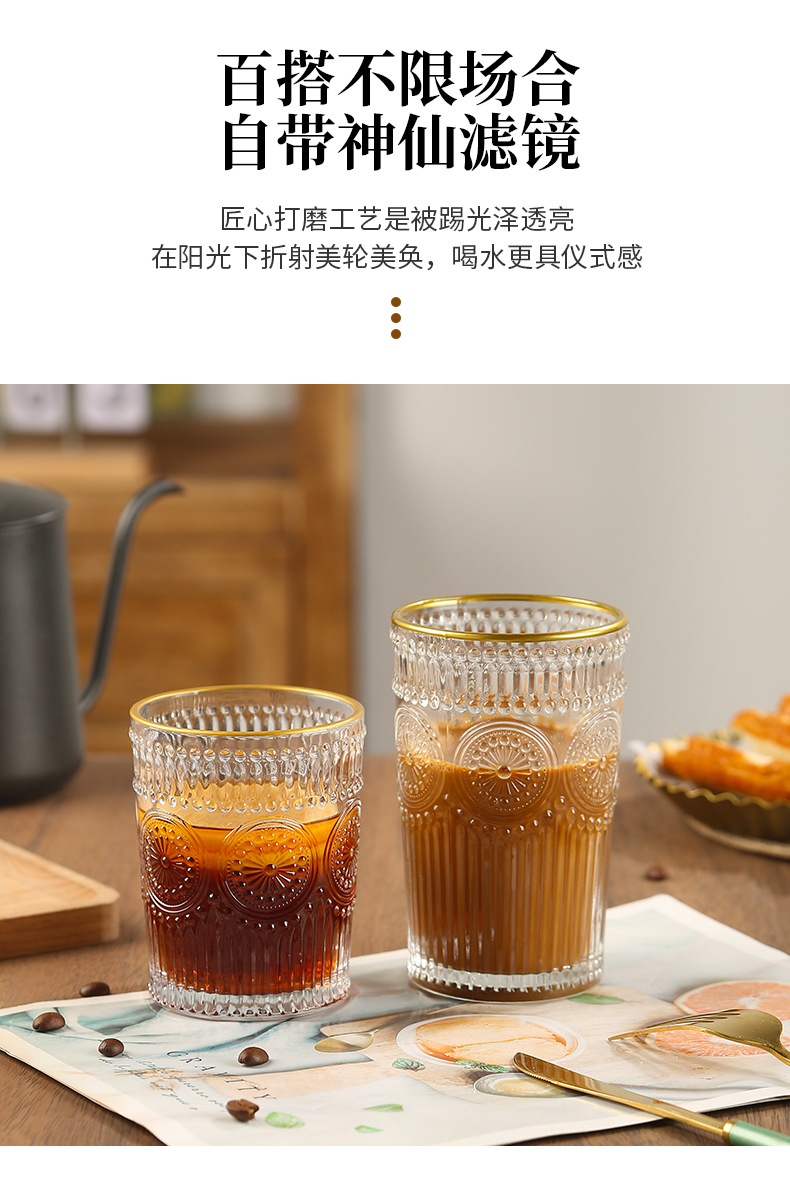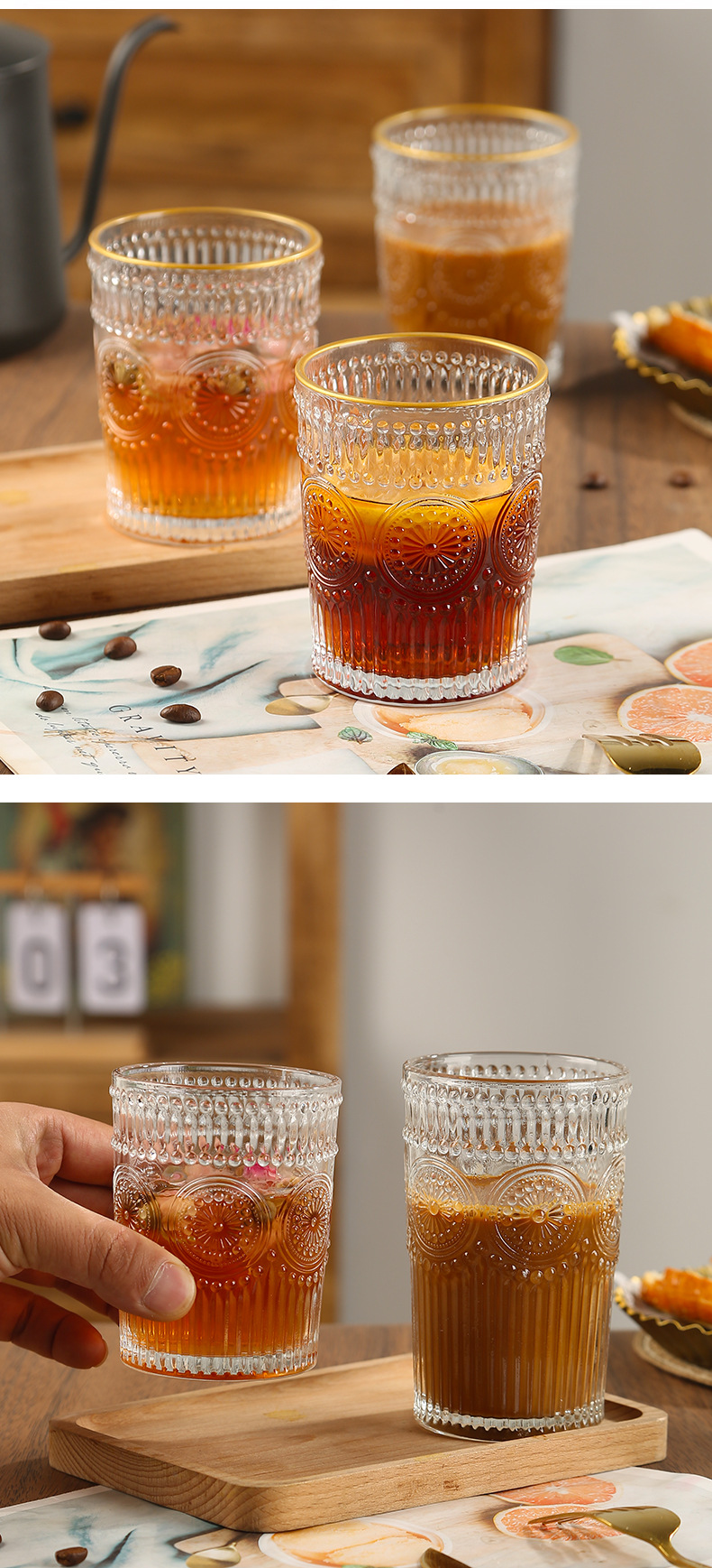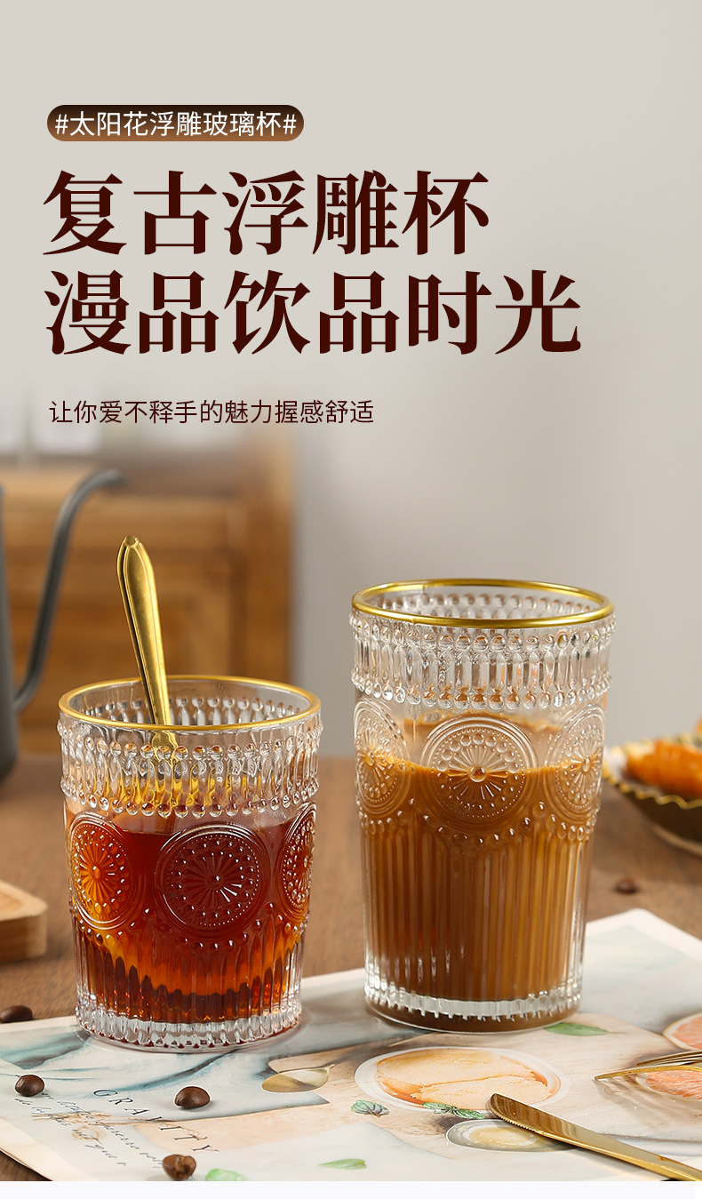 レトロなレリーフ金辺太陽花ガラスコップ円形グラスミルクカップ家庭用ギフトメーカー直販
