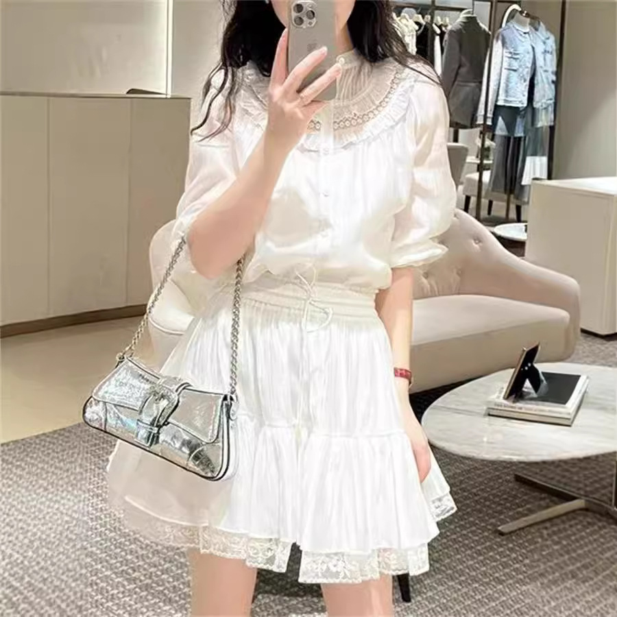 法式优雅2025早秋时尚重工层次花边显瘦短裙木耳衬衫连衣裙