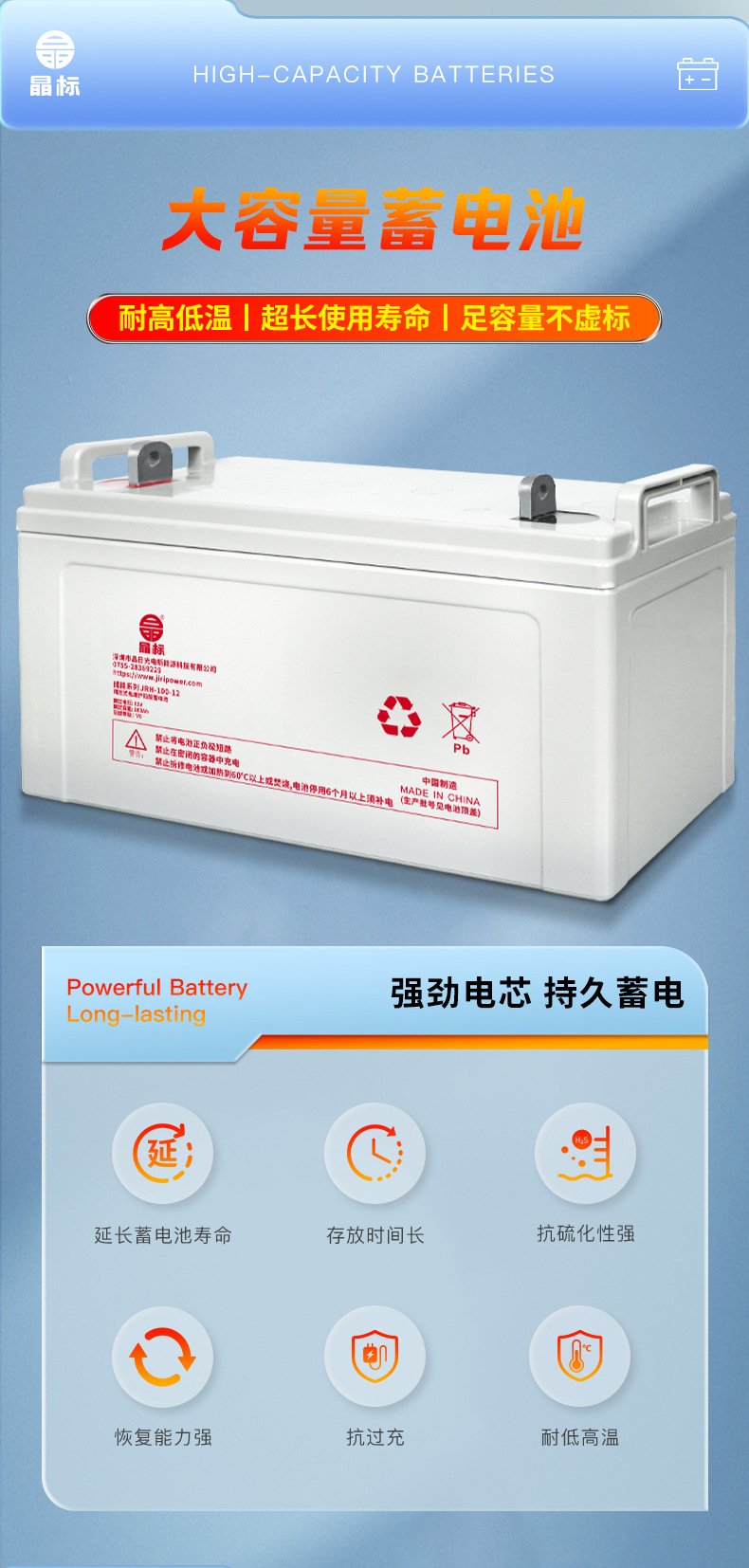 Jingbiao エネルギー貯蔵バッテリーコロイド 12V 太陽光発電システム 24V-65V 完全容量鉛蓄電池