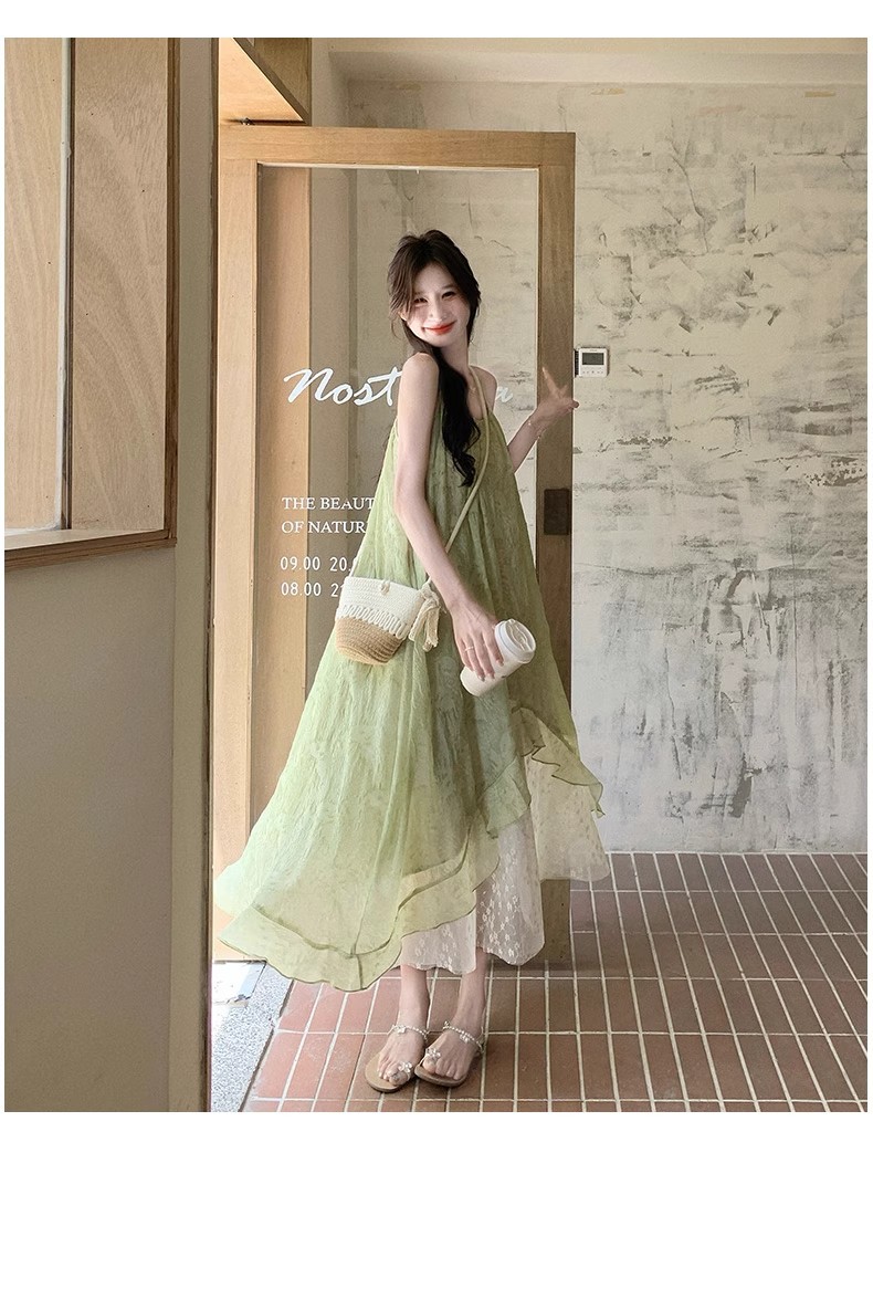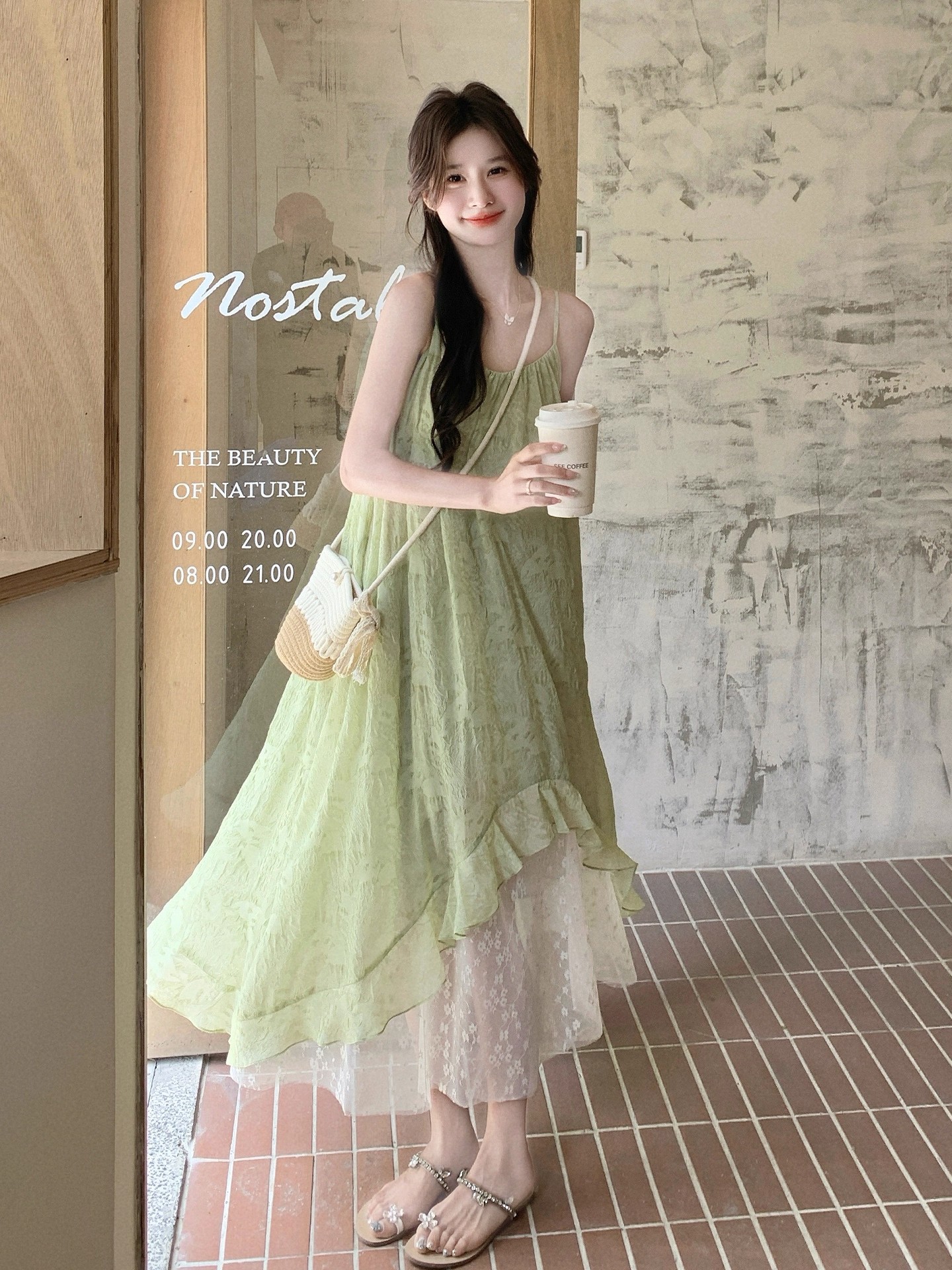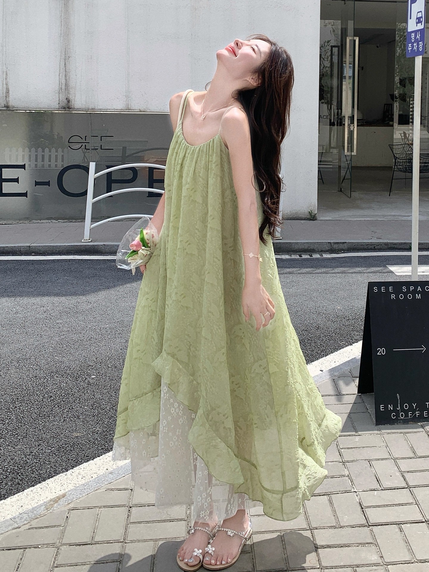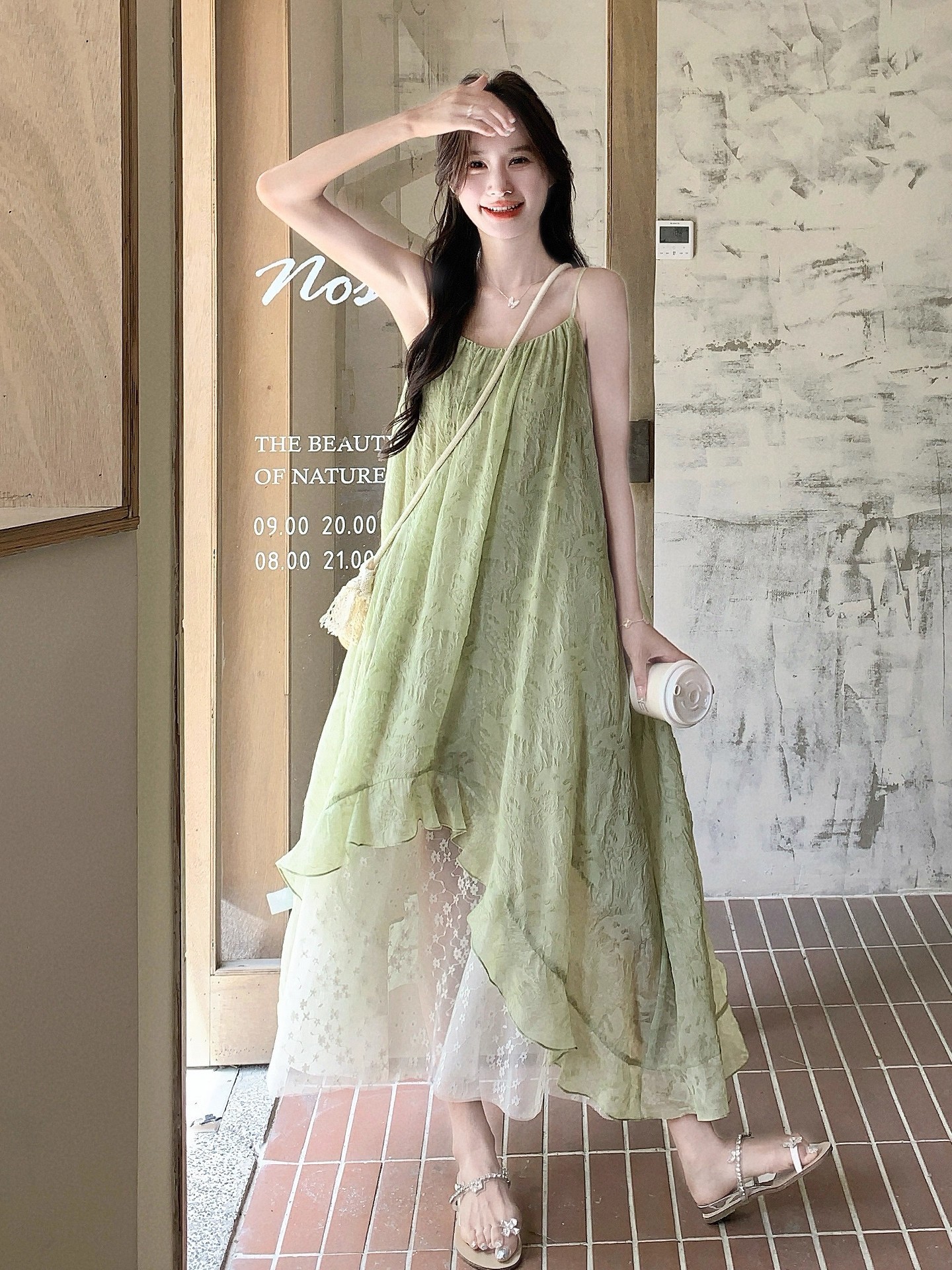 グリーンフォレスト花柄サスペンダードレス女性の夏の 2025 新しいフレンチビーチリゾートシフォン不規則なロングスカート