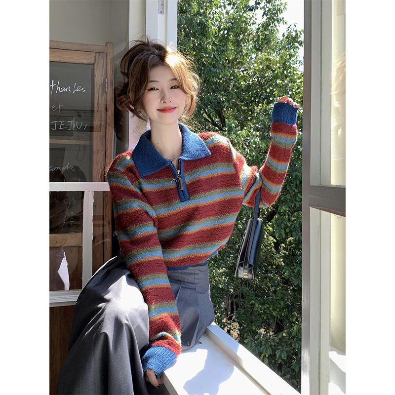 アメリカのレトロPOLO襟のストライプのニットの女性の春秋の小さい背のゆったりしている短い長袖のセーターの独特な上着