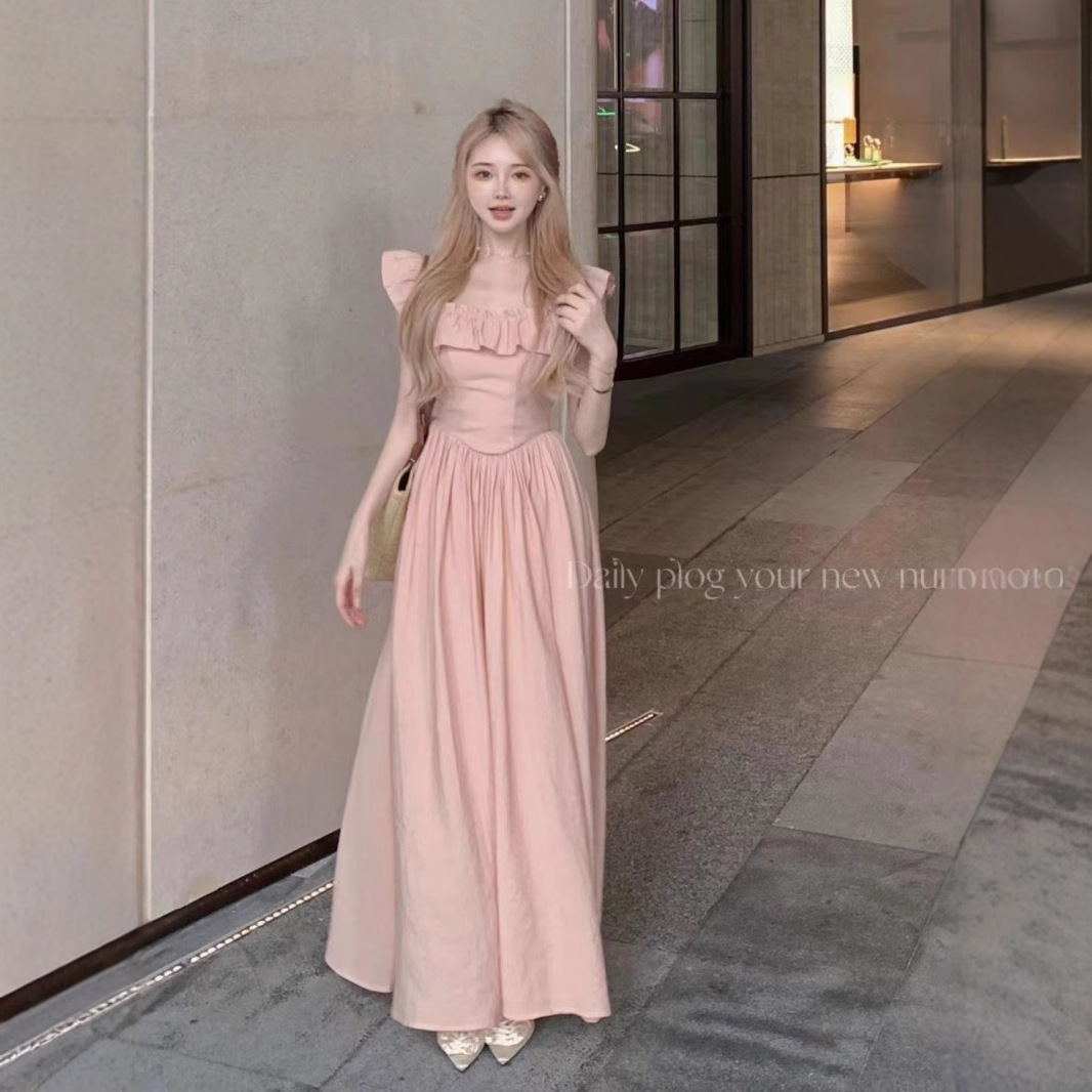 ピンクのハスの葉の縁の方の襟の飛袖のワンピースの夏の女性のフランス式の甘いウエストのスカートの絶美な休暇の長いスカート