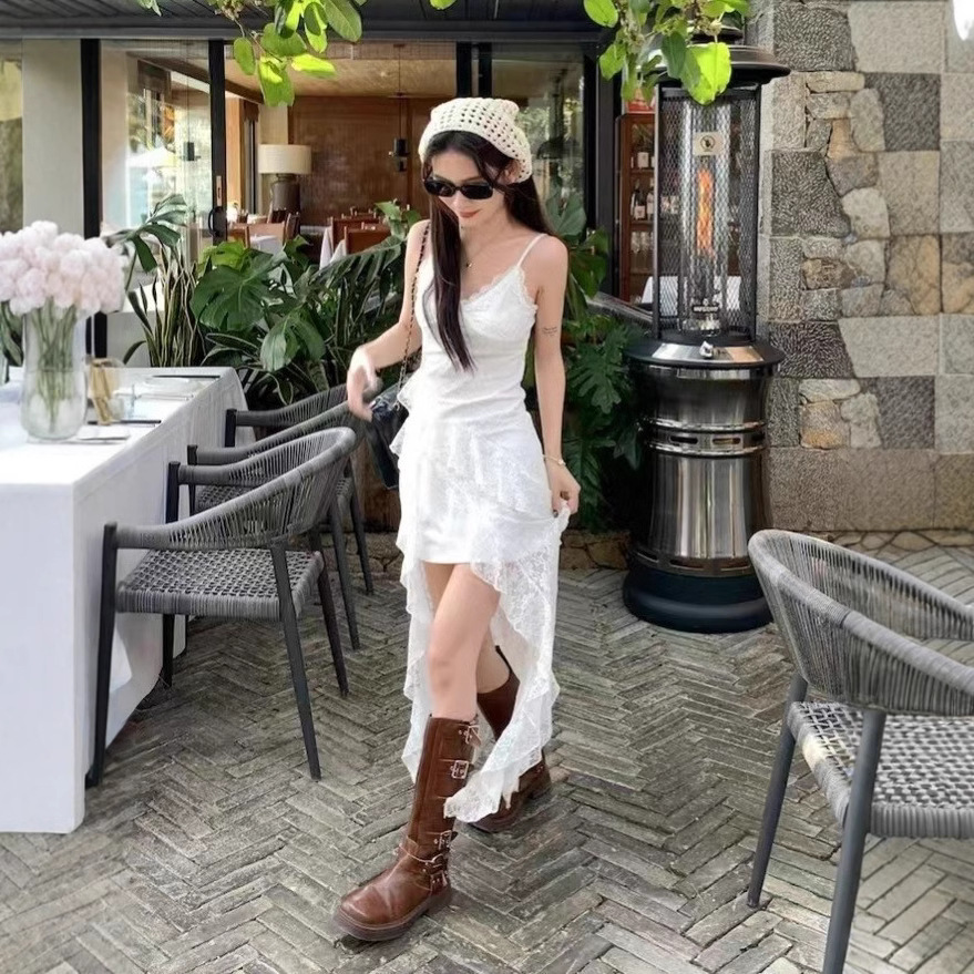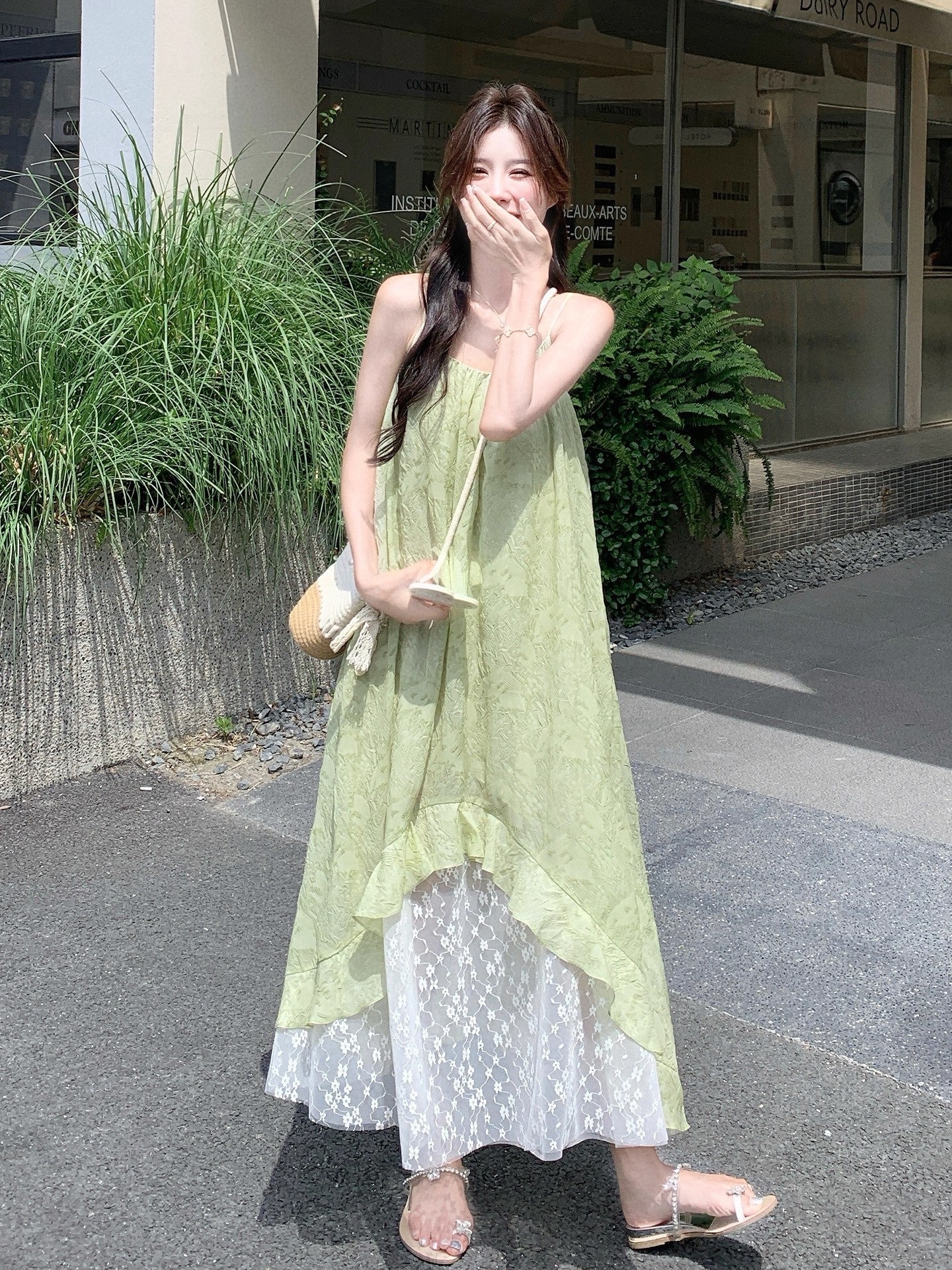 フレンチホワイト不規則なレースのサスペンダードレス女性の夏の海辺の休暇ウエスト痩身スリットロングスカート