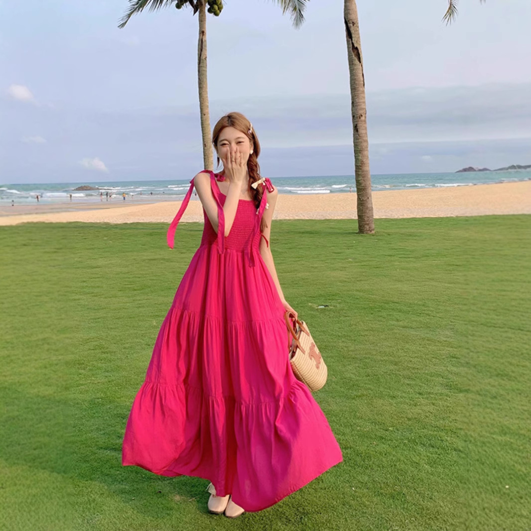 ドーパミンの絶美ピンクのスカートの女性2025の新型の夏の甘い胸の海辺の休暇のサスペンダーのスカートのワンピース