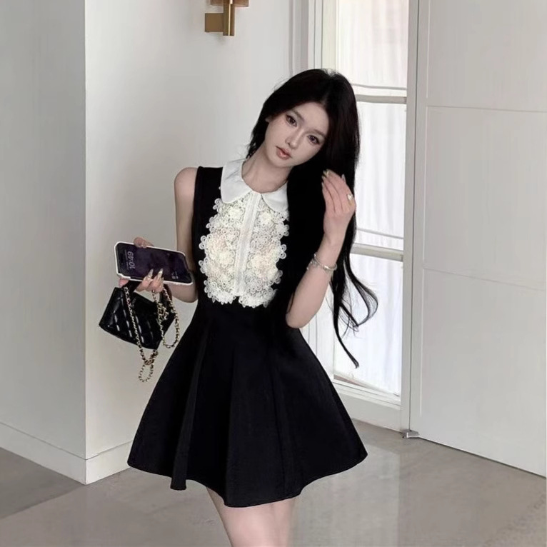 フランスの千金レースの子供の襟のベストのワンピースの女性の夏の小さい香風の気質は腰の袖なしの黒いスカートを収めます。