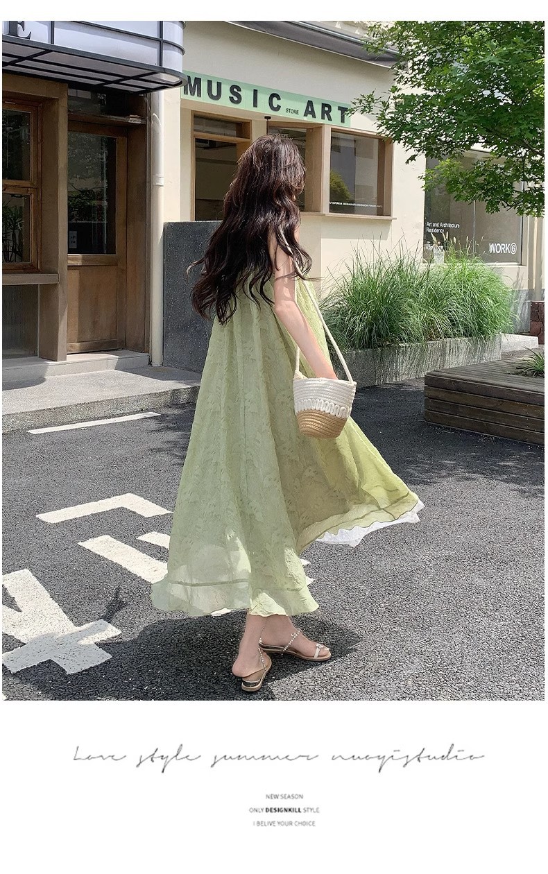 ミントの緑の染めの首のガーターのワンピースの女性の夏の優しくて甘い超仙の初恋のスカートの海辺の休暇の長いスカート