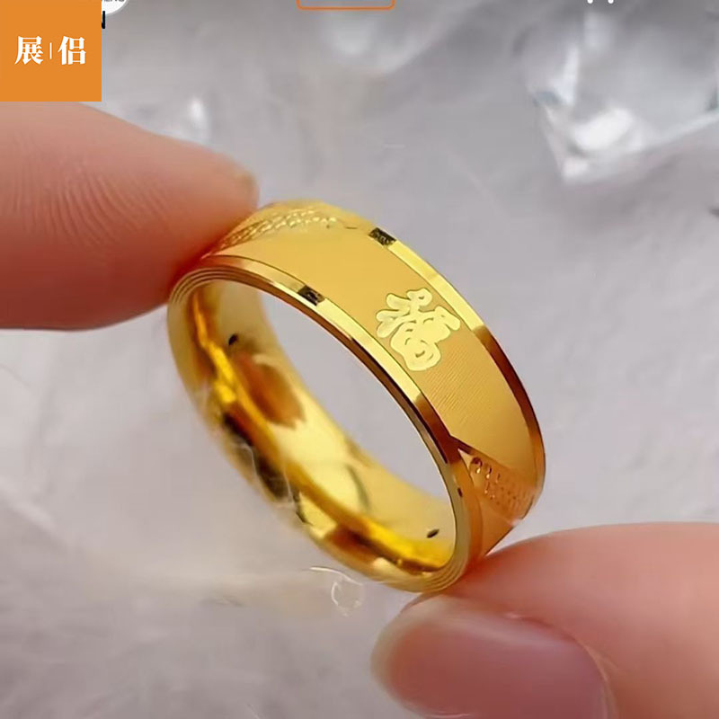 高级感钛钢福字戒指男女款素圈光面轻奢指环时尚个性情侣对戒