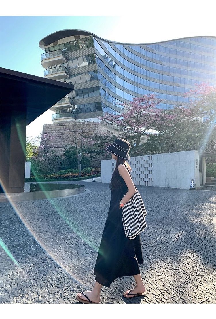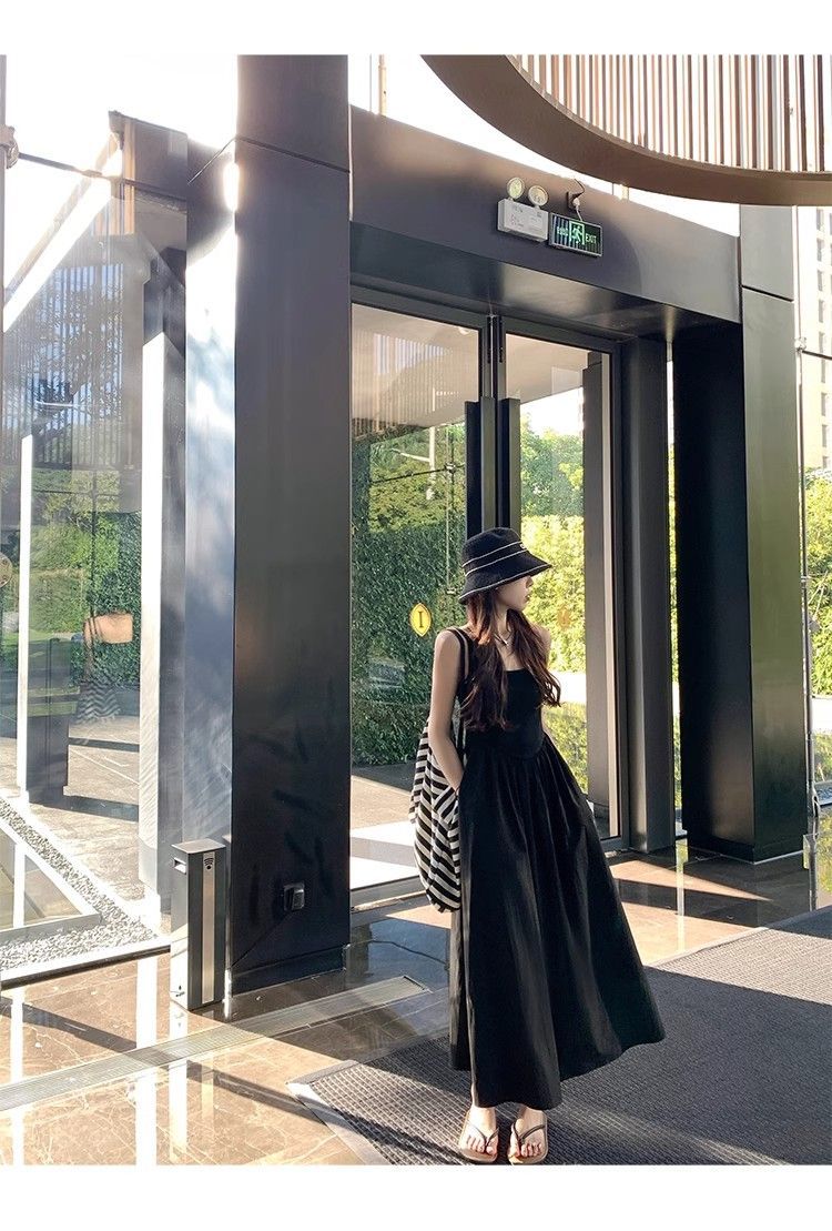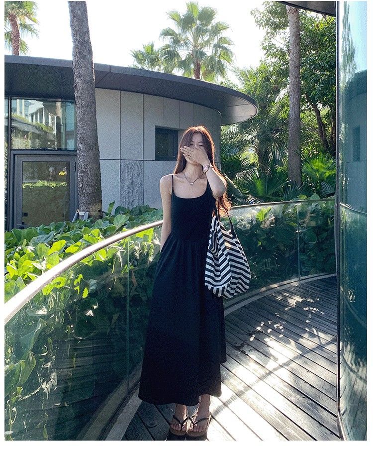 韓国スタイルのファッション気質ソリッドカラードレス夏シンプルなノースリーブミッドレングススカートスリングドレスウエスト痩身
