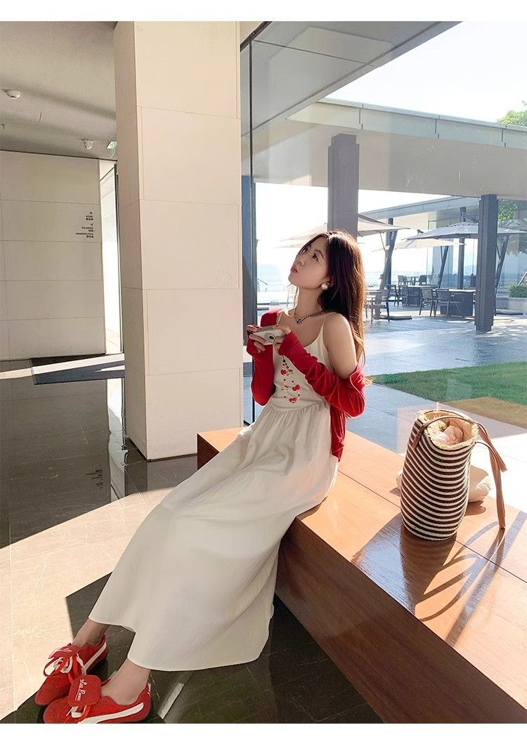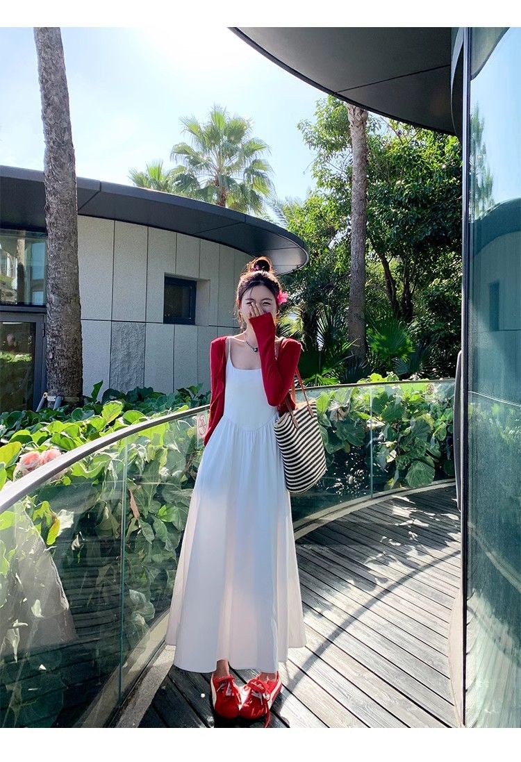 小柄な韓国系の優しい白いストラップワンピース2025春の休暇の甘い気質の長いスカートとカーディガン