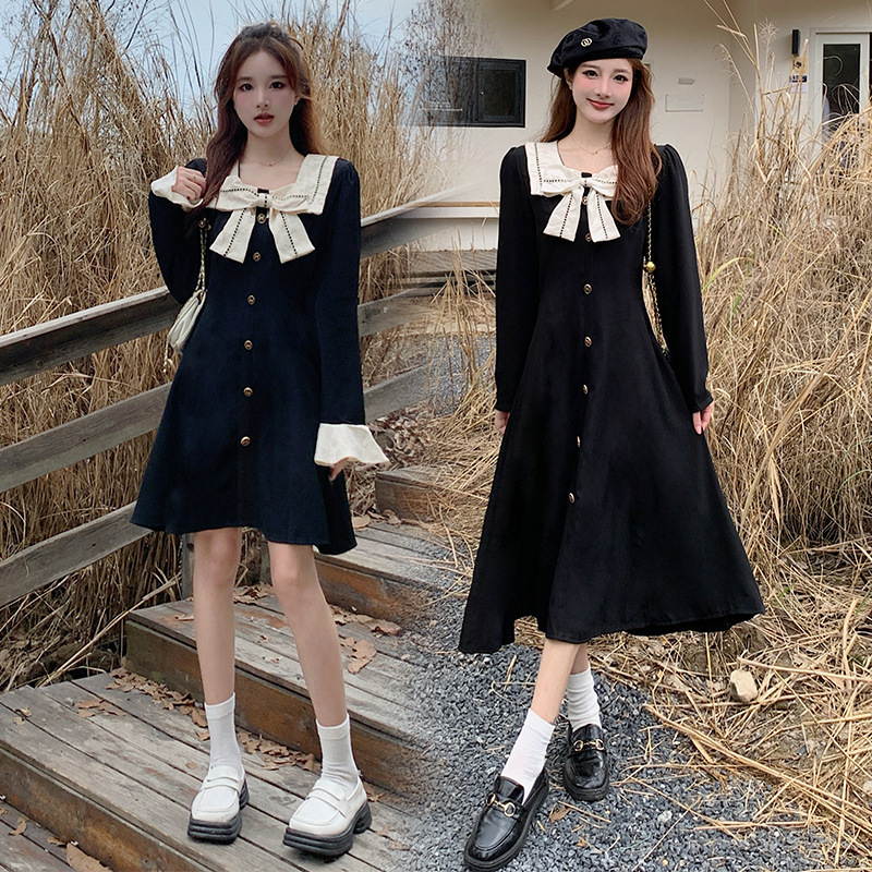 2025秋冬 太め体型向け ハイウエスト リボン付き スクエアネック 長袖ワンピース レディース 韓国風 おしゃれ 若見え Aラインワンピース