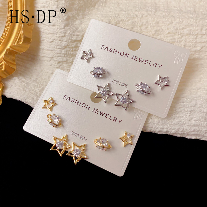 精致时尚轻奢镶钻星星星球三件套耳钉女小众气质简约超闪耳环批发