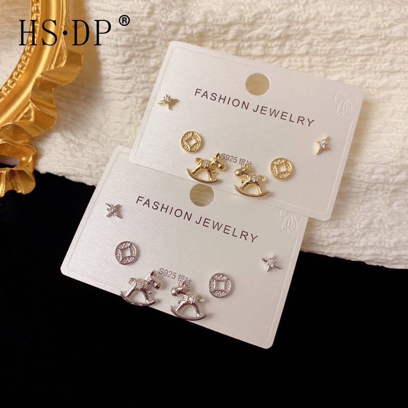 生肖本命年新款时尚简约木马铜钱三件套耳钉精致轻奢百搭小巧耳环
