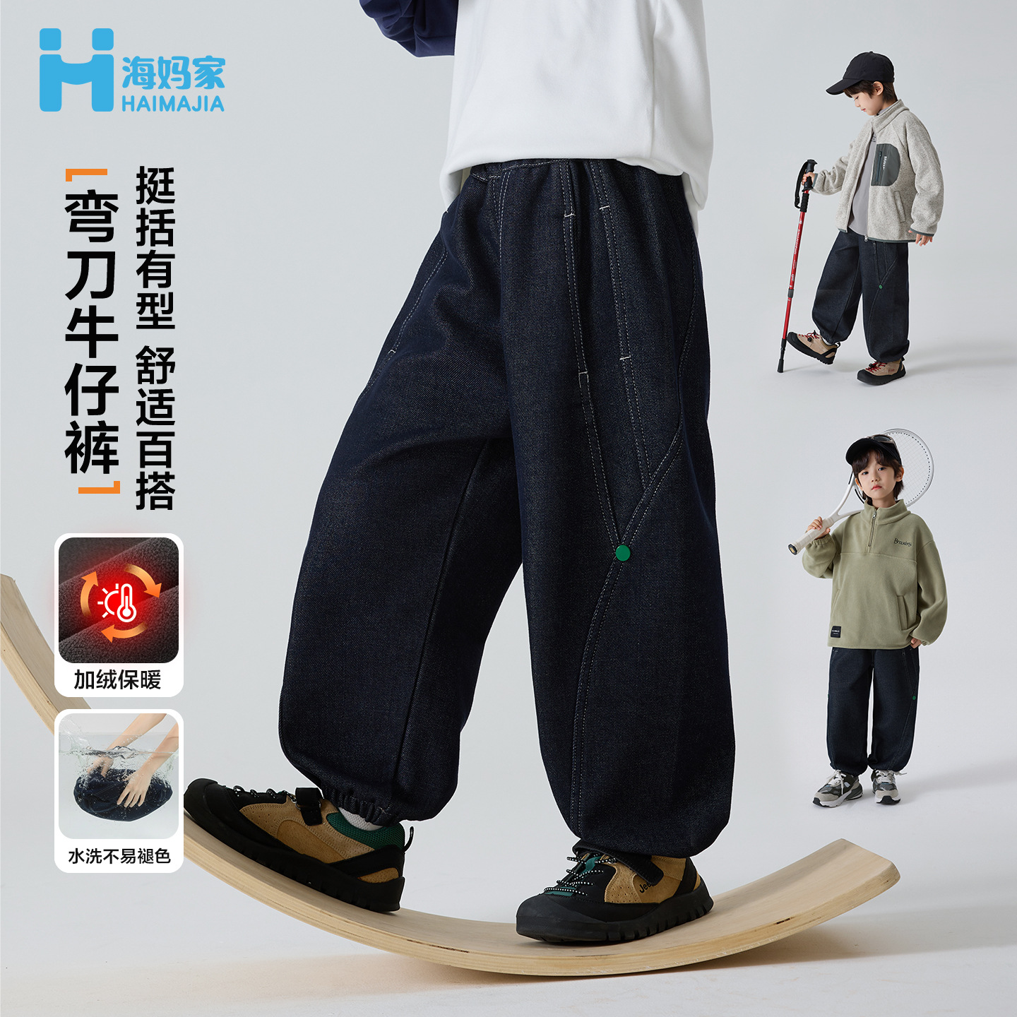 海妈家童装2025冬季新款男童冬装加绒加厚牛仔裤水洗弯刀裤长裤潮