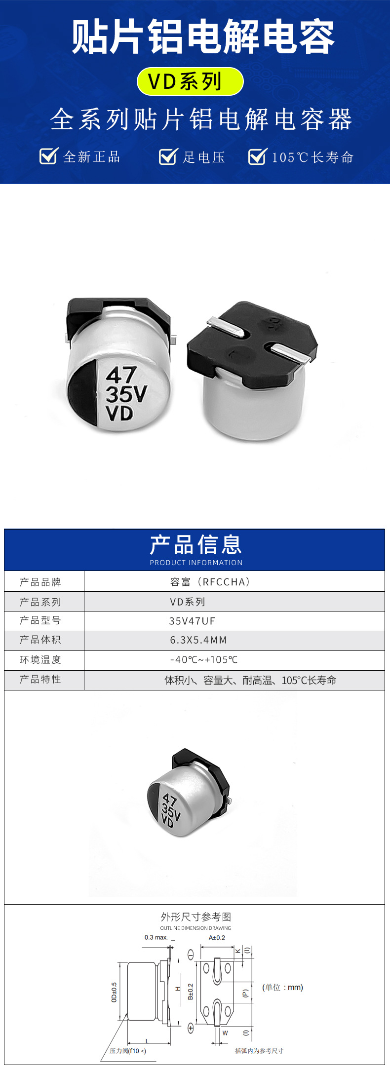 标称容量 16v100uf 6.3*5.4,25v47uf 6.3*5.4,35v47uf 6.3*5.4